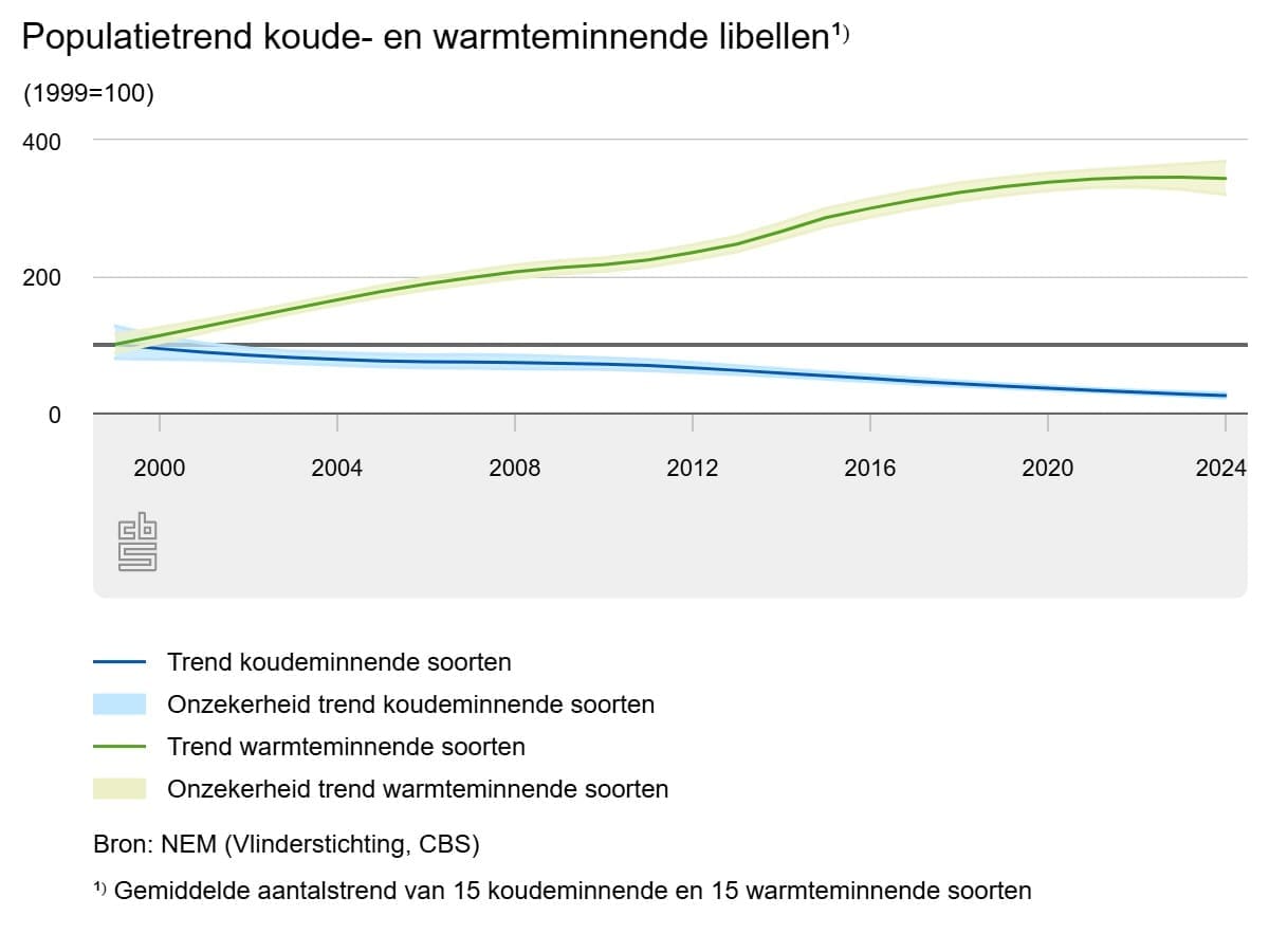 Warmteminnende soorten, zoals de vuurlibel en de zuidelijke keizerlibel, nemen als groep juist toe met gemiddeld 5 procent per jaar. Deze groei vlakt de laatste jaren enigszins af.