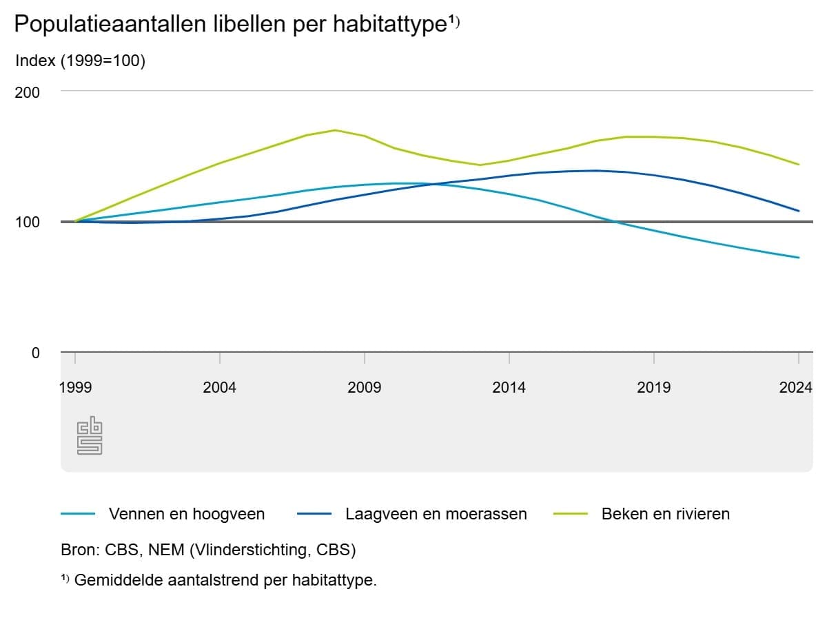 Libellen van laagveen en moerassen, zoals de gevlekte witsnuitlibel, namen aanvankelijk toe, maar zijn sinds 2018 met ruim 20 procent afgenomen. Wel liggen de aantallen libellen van dit leefgebied nog iets boven die van 1999. Libellen van stromend water, zoals de weidebeekjuffer, zijn over de hele periode toegenomen met 43 procent.