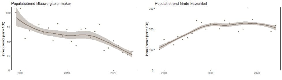 Tijdens de tellingen werd de blauwe glazenmaker vaker waargenomen dan de grote keizerlibel. Dat is opvallend, want in de afgelopen jaren is de grote keizerlibel steeds algemener geworden ten koste van de blauwe glazenmaker.