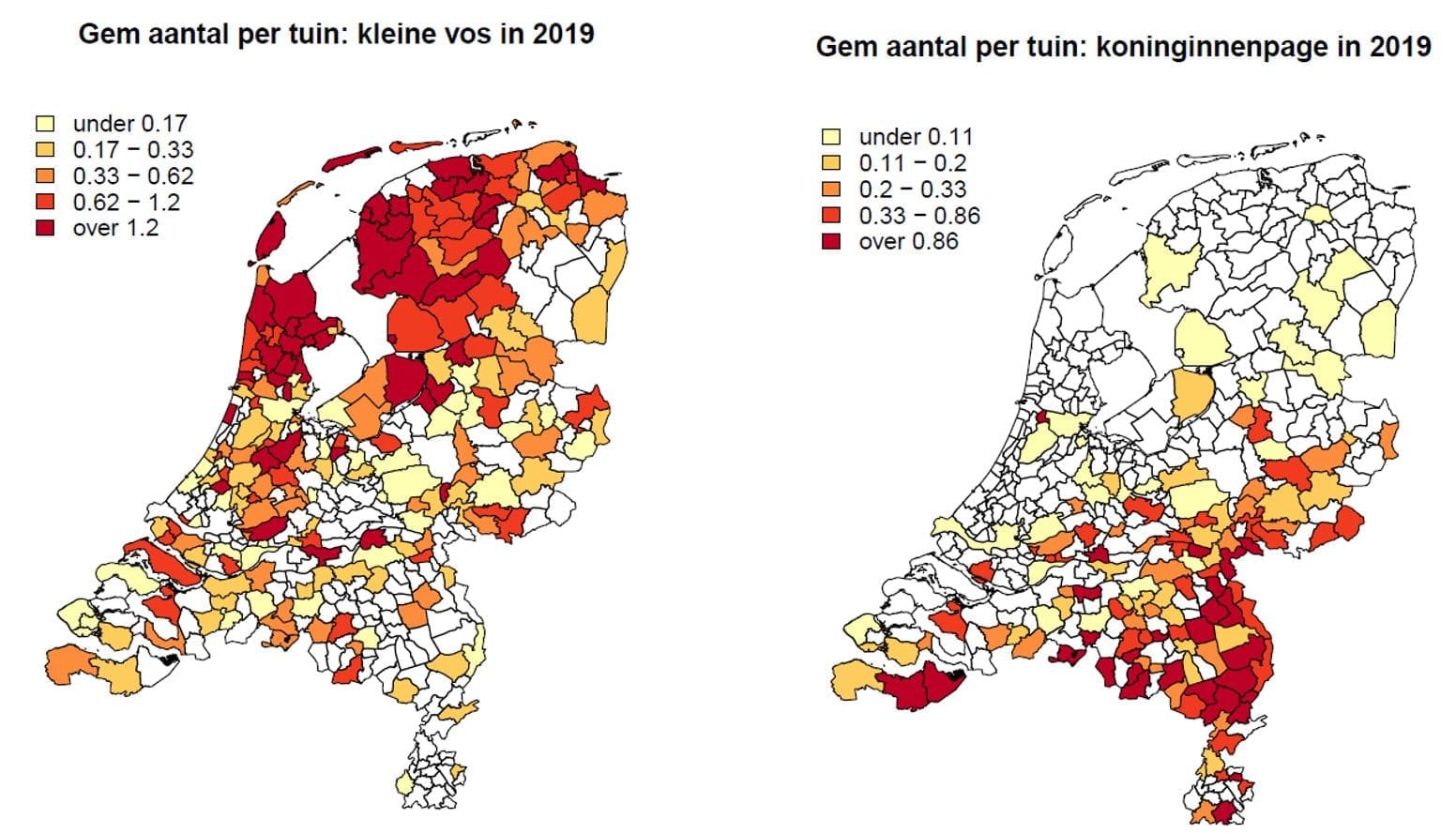 De grote afwezige is de kleine vos. Deze vlinder is vrijwel altijd in de top vijf te vinden, maar dit jaar komt hij niet verder dan plaats twaalf. Ook hier is de hete en droge zomer van 2018 waarschijnlijk de oorzaak; veel rupsen van de kleine vos hebben het toen niet overleefd.
