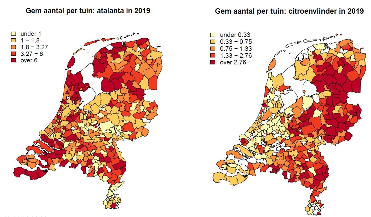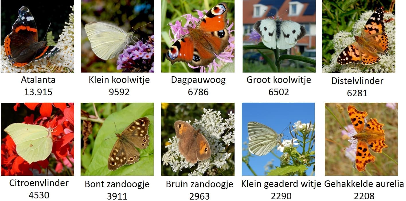 Van 6 tot en met 28 juli 2019 organiseerde De Vlinderstichting de tuinvlindertelling. Er zijn zo’n 10.000 tellingen gedaan. Een kwartier lang noteerde men de vlinders die in de tuin aanwezig waren. Er zijn minder vlinders gezien dan in de voorgaande jaren. De atalanta is de meest getelde vlinder.