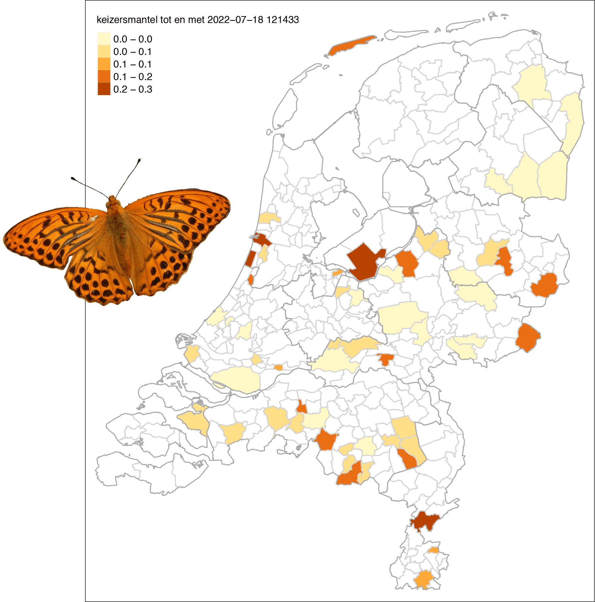 Een geweldige verrassing dit jaar was de keizersmantel. Dit is een soort die normaliter niet veel voorkomt in tuinen en toch waren er verspreid door het hele land al wat tuinwaarnemingen van deze soort doorgegeven. De keizersmantel was daarom speciaal nog toegevoegd aan de tellijst voor deze tuinvlindertelling. Als we wat dieper de resultaten induiken, blijkt dat de winnaar van dit jaar, de dagpauwoog, vooral veel is waargenomen in het noorden van het land. De aantallen in het zuiden waren een stuk minder. Hetzelfde geldt voor het landkaartje. De koninginnenpage is juist veel waargenomen in het zuiden. De laatste jaren breidt deze vlinder zich wel noordwaarts uit, maar de aantallen in het zuiden zijn toch duidelijk groter. Tot slot valt op dat de citroenvlinder voornamelijk is gezien op of rondom de zandgronden.