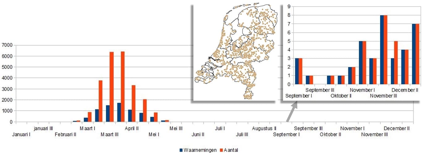 De winterwaarnemingen zijn verspreid door het hele land gedaan. Ook vroeger was er wel eens een wintermelding, maar de laatste jaren zijn het er duidelijk meer. Vooral in de warme winter van 2015 zijn er veel gezien en zijn er waarnemingen van 13 verschillende locaties. In 2016 werd er geen enkele gezien. In de laatste maanden van 2017 werden er ook weer 8 gemeld. Ook in januari (ook in 2018 al) wordt de soort regelmatig gezien en dan komen er ook meer meldingen van meer exemplaren bij elkaar. Dit kun je zien als het voorzichtige begin van de ‘echte’ vliegtijd.