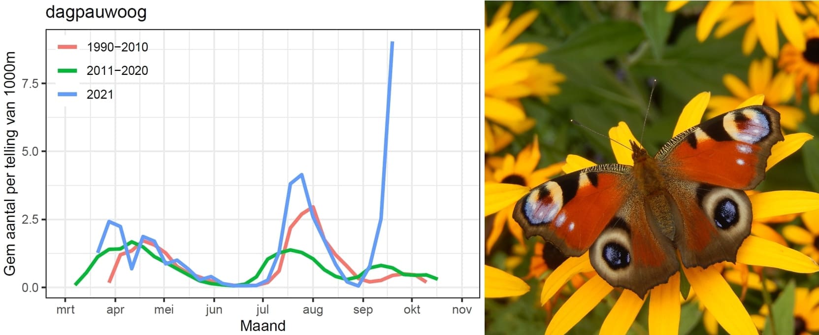 De dagpauwoog komt nu volop tevoorschijn. Enkele weken geleden werden er al veel rupsennesten gemeld, deze rupsen zijn inmiddels verpopt en vliegen nu en de komende weken in een tweede generatie. Meestal is er maar een generatie die in juli en augustus vliegt en heel soms een kleine tweede. Waarschijnlijk speelt de vochtigheid en het feit dat de waardplant brandnetel er florissant bij staat een rol in deze ‘extra’ generatie. De vorige jaren waren heet en droog. Toen was de brandnetel in juli en augustus lang niet zo aantrekkelijk als dit jaar.