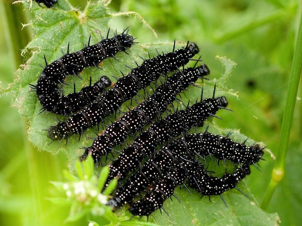 Dagpauwoog, kleine vos en landkaartje leggen de eitjes met meer bij elkaar, soms zelfs wel honderden; die rupsengroepen zijn opvallend en goed te vinden. De dagpauwoog wordt verreweg het meest gemeld op de invoerportalen en dan gaat het inderdaad om duizenden rupsen. Ze zitten in groepen bij elkaar en als ze groot zijn, zoals nu het geval is, zijn ze niet met andere soorten te verwarren. Ze zijn prachtig blauwzwart en hebben kleine opvallende witte stipjes en flinke ‘schijndoorns’ over hun hele lijf. Omdat er wel tweehonderd of driehonderd rupsen bij elkaar kunnen zitten, zie je die alleen in grote pollen brandnetel.