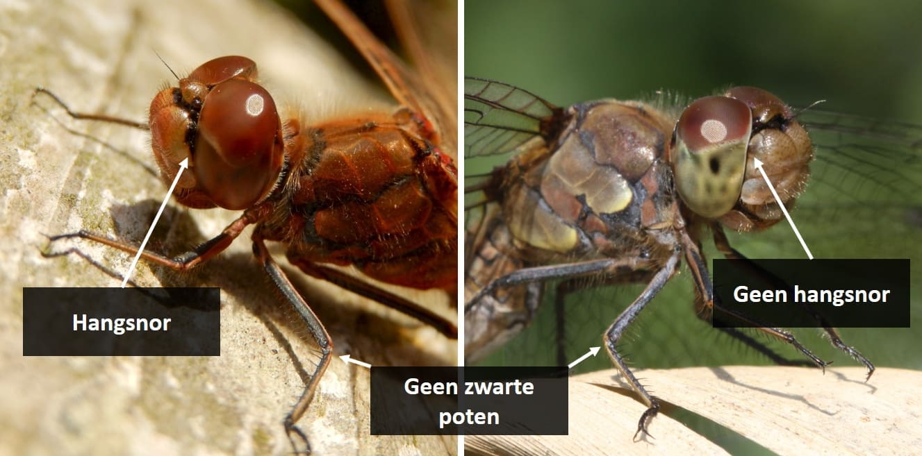 Het eerste waar je naar kunt kijken bij de determinatie van deze drie moeilijk te onderscheiden heidelibellen is de kleur van de poten. Bij de bloedrode heidelibel zijn deze helemaal zwart, bij de twee andere soorten zijn de poten zwart met geel of lichtbruin. Bij deze twee soorten komt een tweede kenmerk om de hoek kijken: de hangsnor. Bekijk de libel hiervoor schuin van voren. Loopt er tussen het oog en de rest van de kop een zwart streepje naar beneden (de ‘hangsnor’), dan heb je te maken met een steenrode heidelibel. De bruinrode heidelibel heeft wel wat zwart boven de snuit, maar dat loopt niet door naar beneden.