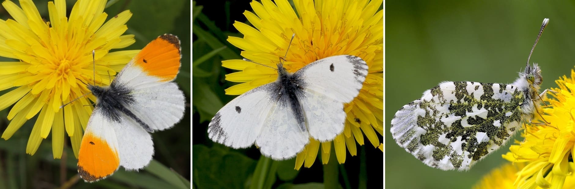 Het klein koolwitje kun je eigenlijk overal tegenkomen, zelfs als er geen of maar heel weinig bloemen zijn. Ze kunnen flinke afstanden afleggen en doorkruisen dan ook saaie groene woestijnen en stedelijk gebied. Een ander witje dat de komende tijd tevoorschijn komt, het klein geaderd witje, is ook algemeen. De vlinder houdt wat meer van ‘natuurlijke’ gebieden. Dit geldt nog sterker voor het oranjetipje. Dat vind je in bloemrijke, vaak vochtige, graslanden. Altijd in de buurt van de bosrand of van bomen of struiken. Maar ook in het stedelijk gebied kom je ze wel tegen. Vooral de mannetjes zijn erg opvallend, want zij hebben die oranje vleugelpunt. De vrouwtjes lijken wel op koolwitjes, maar de onderkant, met die mooie olijfgroene tekening, is heel anders waardoor ze toch goed te herkennen zijn.