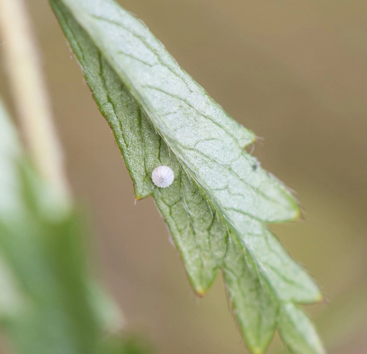 Na de paring vliegt het vrouwtje laag boven de vegetatie op zoek naar een geschikte waardplant. Zij heeft een voorkeur voor kleine, jonge planten die in een lage vegetatie groeien. Voor ze de eitjes afzet inspecteert ze het blad zorgvuldig door eroverheen te lopen, waarbij ze met een gekromd achterlijf de onderzijde van het blad aftast. Er wordt één eitje op de onderzijde van een goedgekeurd blad afgezet.