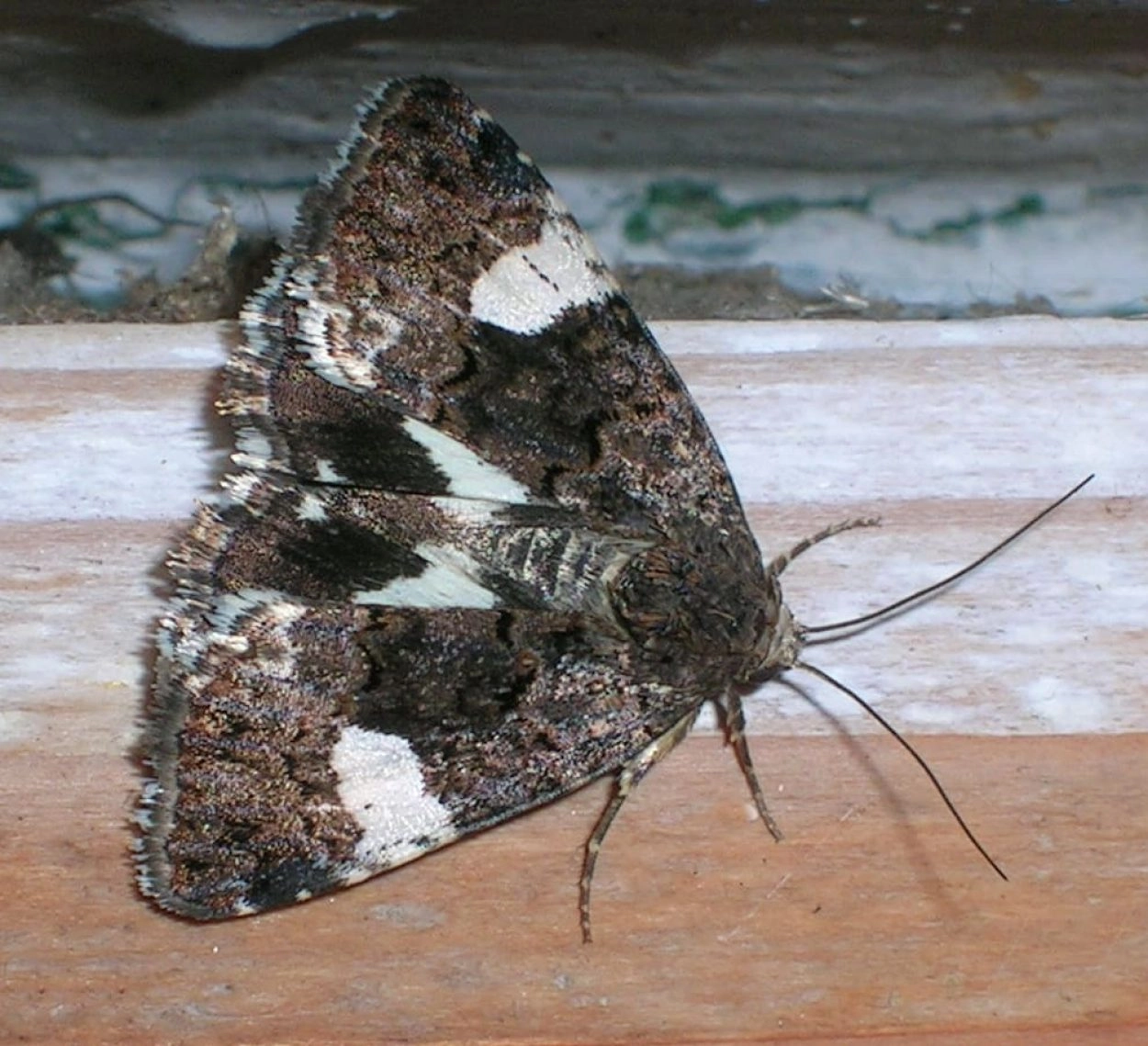 Voorvleugellengte: 12-13 mm. Deze uil is goed te herkennen aan de grote witte vlek langs de voorrand van de bruinachtig en zwart gekleurde voorvleugel; in de binnenrandhoek bevindt zich een kleine witte vlek. Een ander belangrijk kenmerk is de witte band op de achtervleugel die gedeeltelijk zichtbaar is wanneer de vlinder met enigszins gespreide vleugels neerstrijkt.