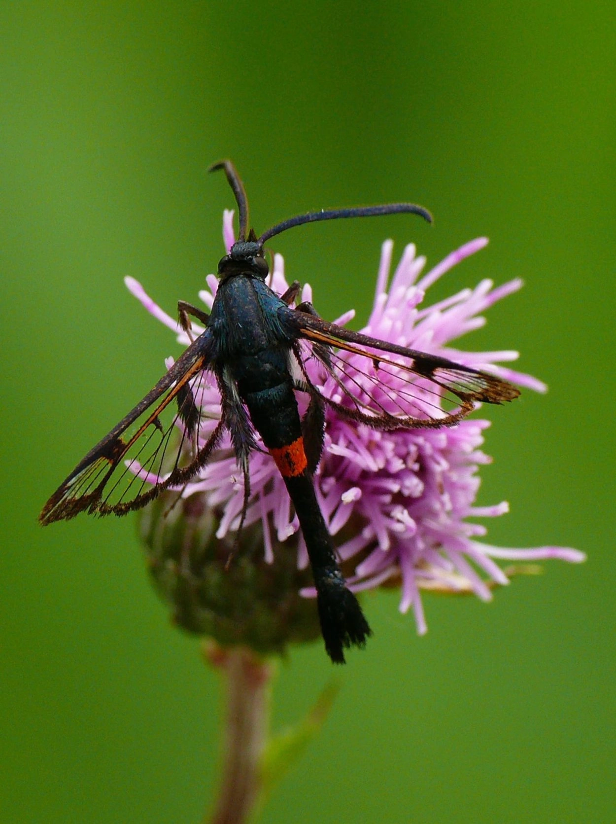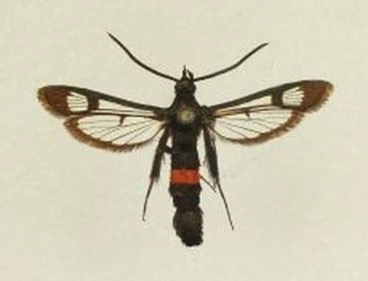 Voorvleugellengte: 9-11 mm. Een goed herkenbare wespvlinder waarvan met uitzondering van de rode band op het achterlijf, het lichaam, het staartpluimpje, de poten en de antennen geheel zwart gekleurd zijn. Ook de voorvleugel is vrijwel geheel zwart, alleen het veld in het vleugeluiteinde, dat relatief breed is, heeft een donkerbruine kleur. De palpen zijn zwart behaard, bij het mannetje deels ook wit.