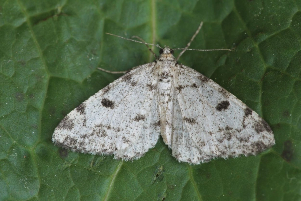 Voorvleugellengte: 13-16mm. Het kleine formaat en de overwegend witte kleur zijn kenmerkend voor deze spikkelspanner. Vooral op de voorvleugel bevindt zich een opvallende zwarte middenstip. De gestippelde buitenste dwarslijn maakt een hoek bij de voorrand en bij de binnenrand en eindigt bij de binnenrand en voorrand vaak in een duidelijke zwarte vlek. Witte exemplaren zijn fijn zwart bestoven, maar soms komen ook volledig bruinachtige exemplaren voor.