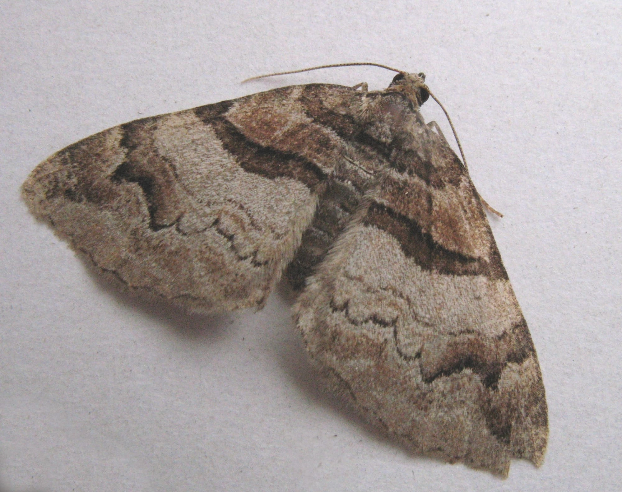 Voorvleugellengte: 13-15 mm. De grondkleur van de voorvleugel is voornamelijk lichtbruin. Opvallend zijn het smalle donkerbruine bandje in de vleugelwortel en de donkere streep langs de binnenzijde van de middenband. De witachtige middenzone van deze middenband is vrij variabel. De buitenste zone van de middenband, die bij de voorrand van de vleugel donkerbruin is en in de richting van de binnenrand steeds lichter wordt, wordt begrensd door een grillige zwarte lijn. Deze lijn heeft bij de voorrand een zwartgerand scherp uitsteeksel en gaat daarna over in een diepe ronde uitstulping, die lijkt op een donkere maanvormige vlek. Ook bij afgevlogen exemplaren blijft dit kenmerk goed zichtbaar. De achtervleugel is lichtbruinachtig wit met een donkere zoom.