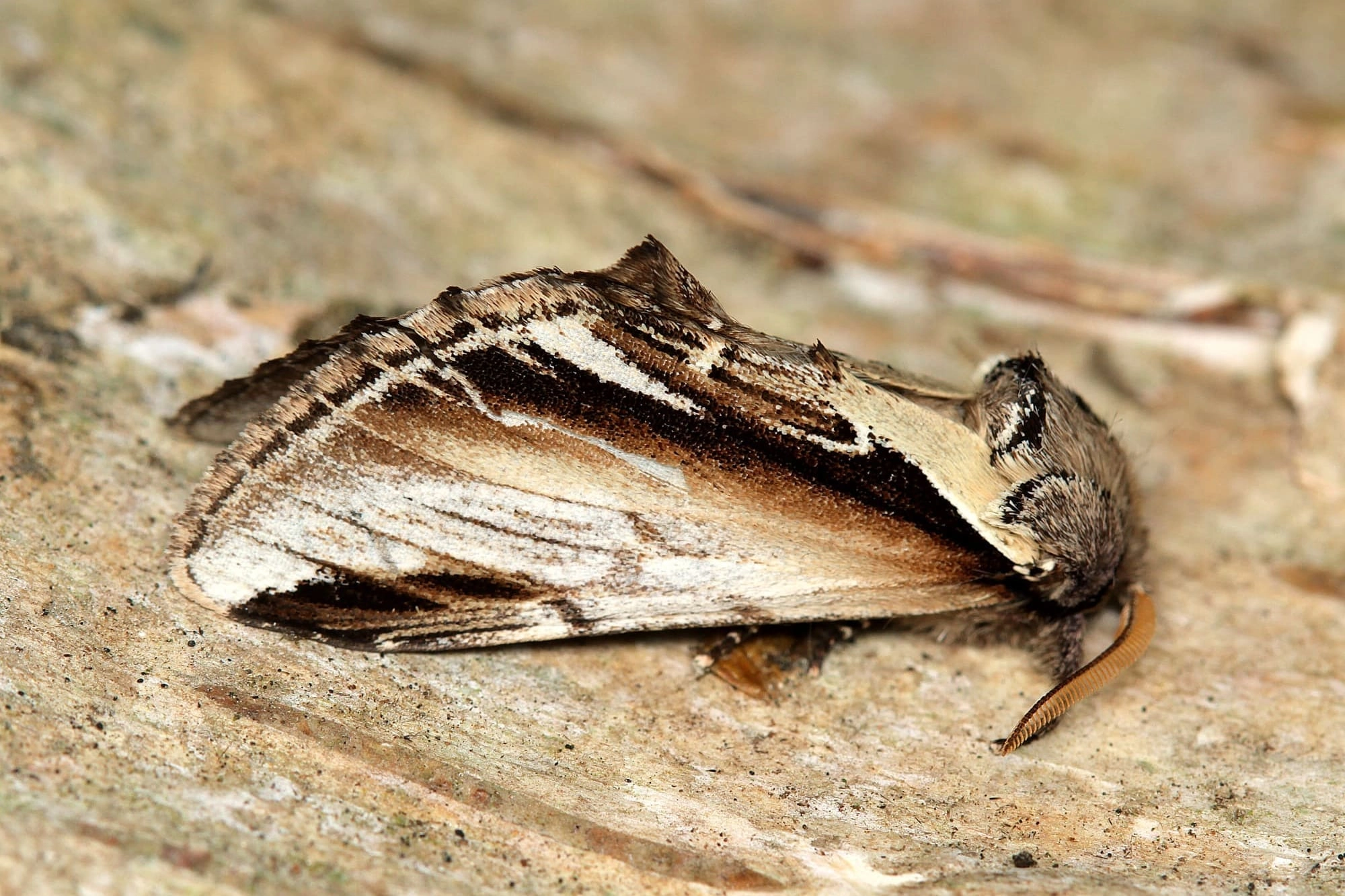 Brandvlerkvlinder (Pheosia tremula).N.B.: vergelijk behalve de uiterlijke kenmerken ook de tijd van het jaar waarin de rupsen voorkomen, het habitat en de waardplant(en).