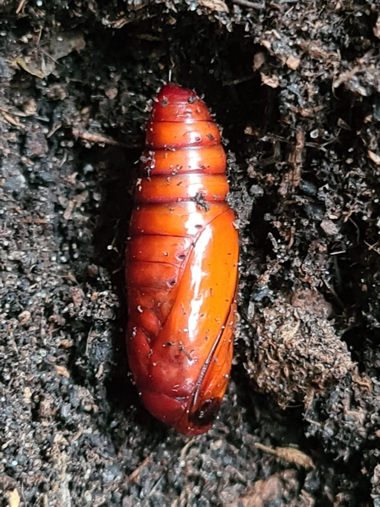 Tot 42 mm; vrij plomp, achterste segmenten enigszins gezwollen; lichaam grijsachtig bruin met op de bovenzijde een purperachtig rode zweem; over de rug twee rijen zwarte streepjes, die op het elfde segment in een dwarsband eindigen met daarachter een opvallende, witachtige veeg; kop bruin met zwartachtige banden.