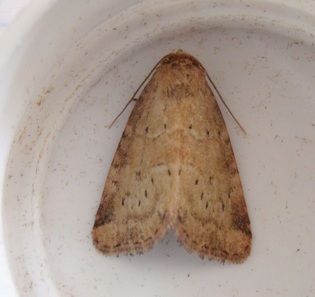 Voorvleugellengte: 11-14 mm. Deze slank gebouwde uil heeft een strokleurige, soms roodachtig bruin getinte voorvleugel met een geleidelijk gebogen voorrand. Het mannetje is groter dan het vrouwtje, heeft een relatief bredere voorvleugel en een eenvoudige tekening. De geschulpte centrale dwarslijnen zijn meestal slechts zichtbaar als een rij zwartachtig bruine stippen of streepjes. Langs de voorrand van de voorvleugel ligt aan de buitenzijde van de sterk gebogen buitenste dwarslijn een driehoekige donkere vlek, die soms vaag is. In sommige gevallen gaat deze vlek min of meer over in een eveneens donkere zone langs de golflijn. Het vrouwtje is kleiner, heeft een smallere voorvleugel en een minder gelijkmatige tekening. De centrale dwarslijnen zijn doorgaans duidelijk zichtbaar en hebben, evenals de golflijn, aan beide zijden een lichte rand. In het middenveld ligt een donkere band, die vooral langs de binnenrand van de vleugel goed zichtbaar is. Opvallend is het slanke, relatief lange achterlijf.