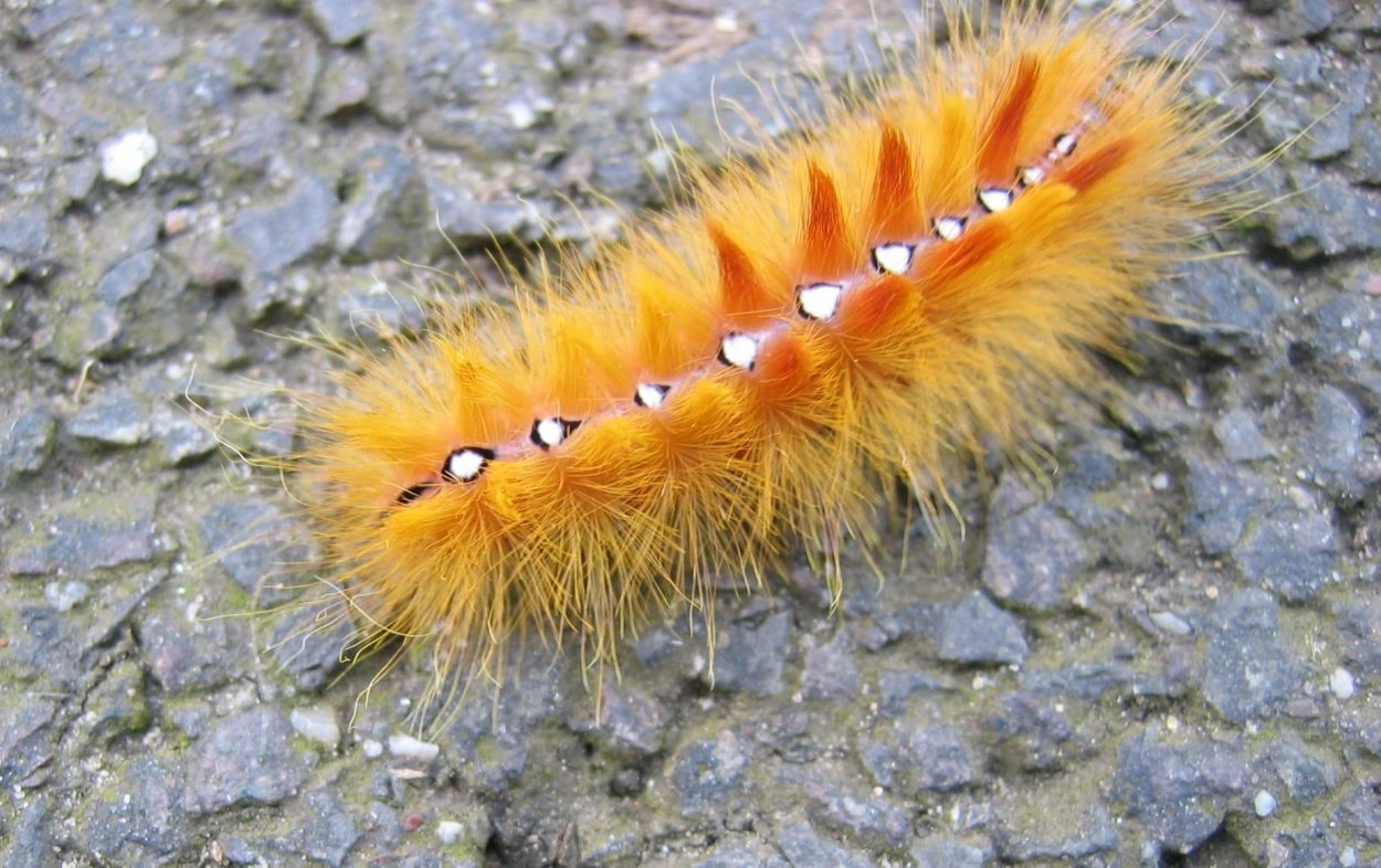 Tot 40 mm; lichaam grijsachtig bruin, bedekt met dichte penselen van lange, lichtgele of oranje haren en op de rug vier paar roodachtige haarborstels; over het midden van de rug een rij zwartgerande, ruitvormige, witte vlekken; kop donkerbruin.