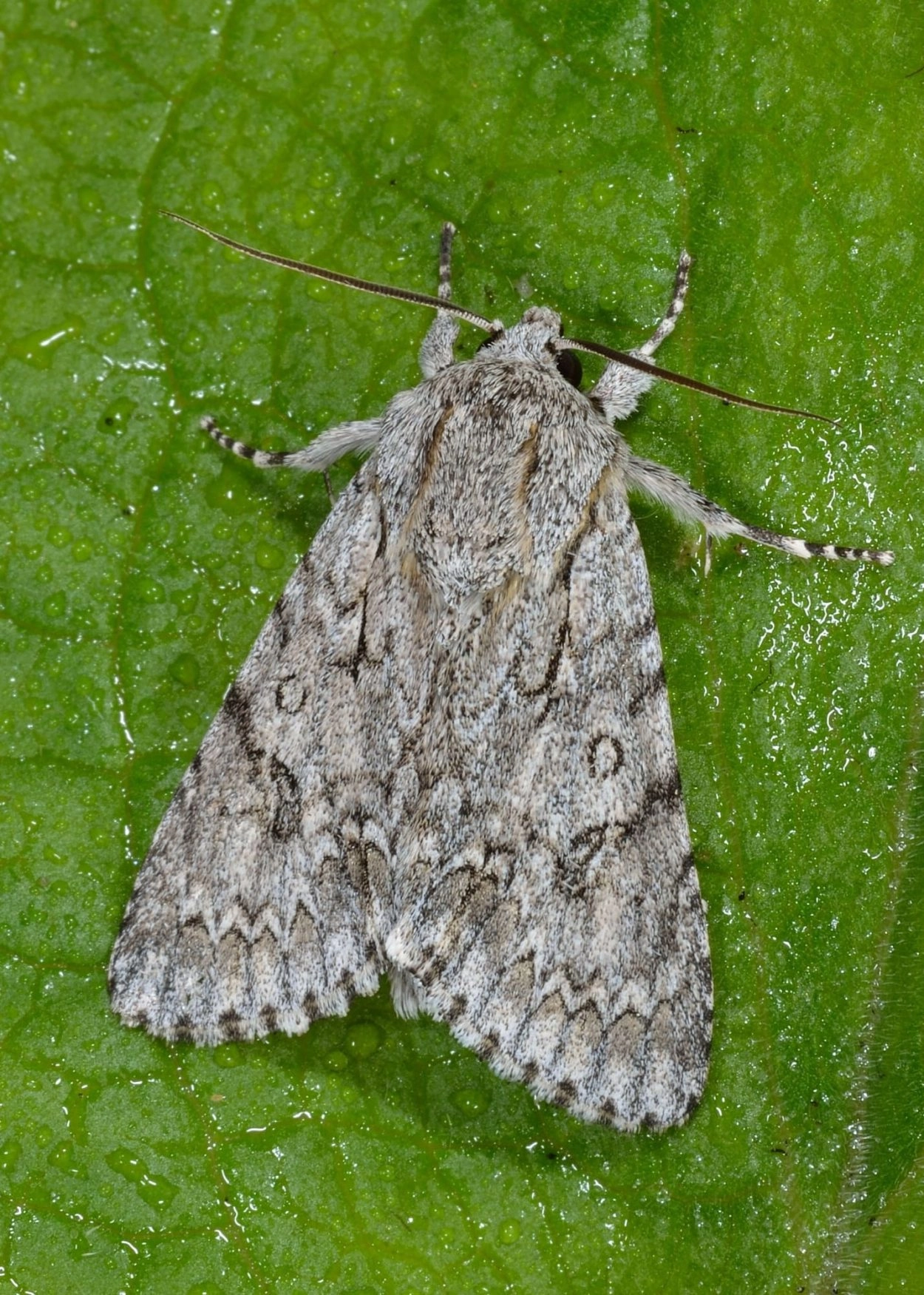 Voorvleugellengte: 18-22 mm. De voorvleugel van deze Acronicta-soort is breed, bij het mannetje iets smaller, en heeft een koele lichtgrijze grondkleur. De vleugel is bruinachtig grijs bespikkeld, vooral langs de buitenzijde van de buitenste dwarslijn. Langs de binnenzijde van de S-vormige buitenste dwarslijn ligt een smalle zoom die bestaat uit kleine lichtgekleurde blokjes; deze zoom is altijd duidelijk, ook bij donker gekleurde exemplaren. In het wortelveld bevindt zich gewoonlijk een lange vertakte zwarte wortelstreep. De achtervleugel van het mannetje is witachtig, die van het vrouwtje grijsachtig wit; op de achtervleugel zijn donkere aders zichtbaar.