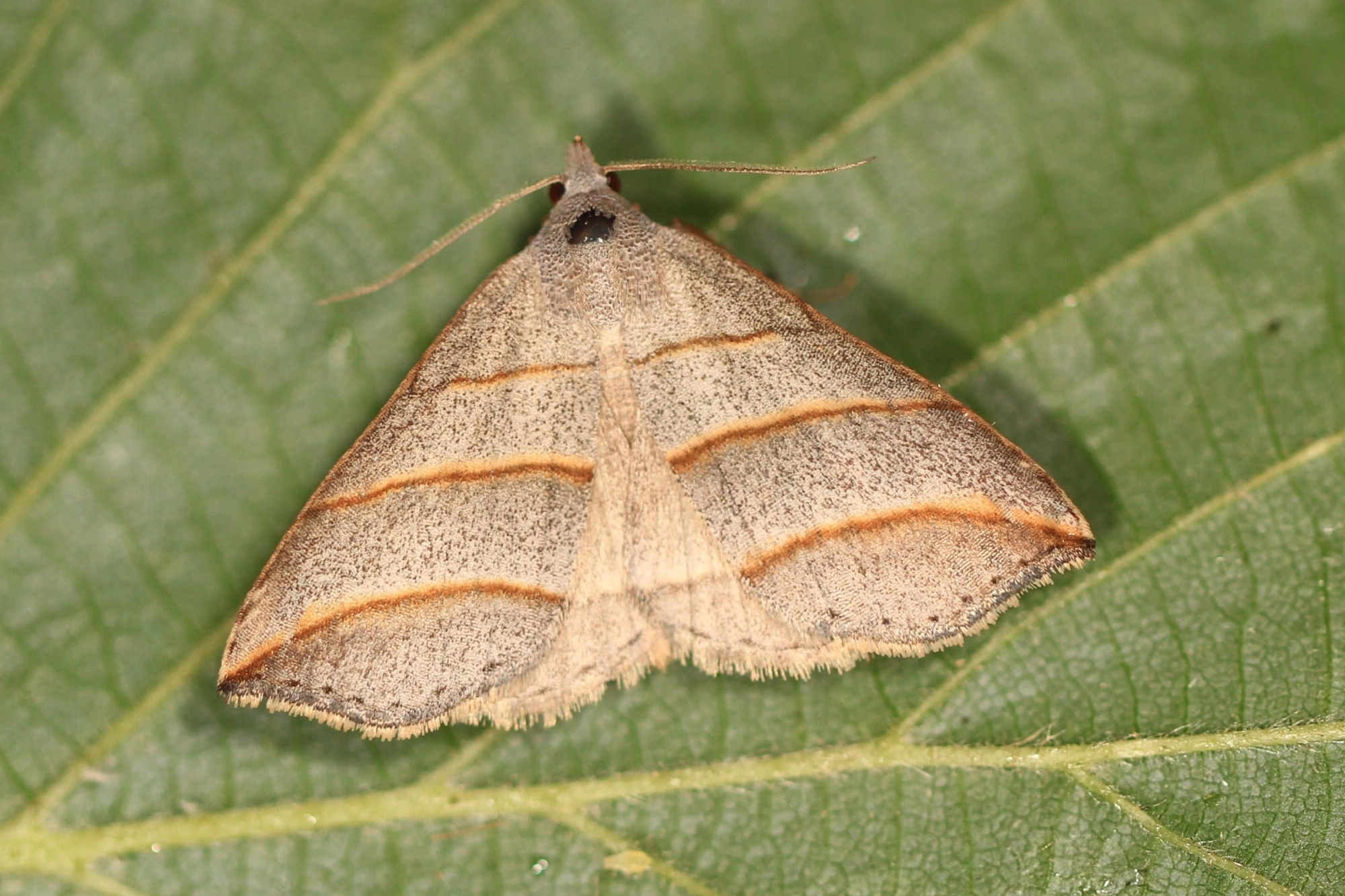 Voorvleugellengte: 13-15 mm. De rusthouding van deze snuituil doet enigszins denken aan een deltavorm met scherpe hoekpunten. De voorvleugel heeft een lichtgrijze grondkleur met een fijne donkere spikkeling. Kenmerkend zijn de drie roodachtig bruine dwarslijnen, waarvan de buitenste via een gelijkmatige boog in de vleugelpunt eindigt; de dwarslijnen zijn afgezet met een geelachtige rand.