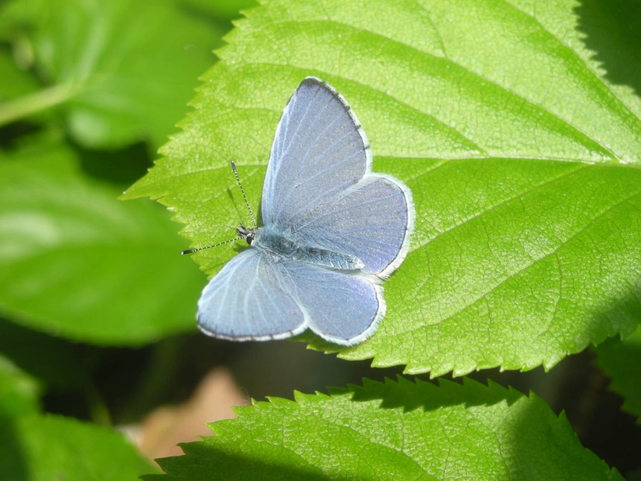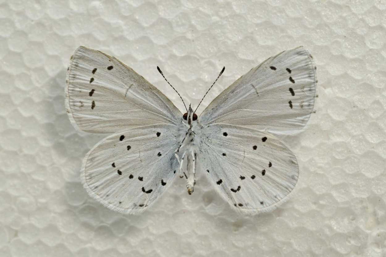Voorvleugellengte: circa 14 mm. De bovenkant van de vleugels is bij het mannetje waterig lichtblauw met smalle zwarte randen en bij het vrouwtje lichtblauw met brede tot zeer brede zwarte randen. De onderkant van de vleugels is zilvergrijs met kleine zwarte stippen. De achtervleugel heeft geen oogvlekken en geen staartje.