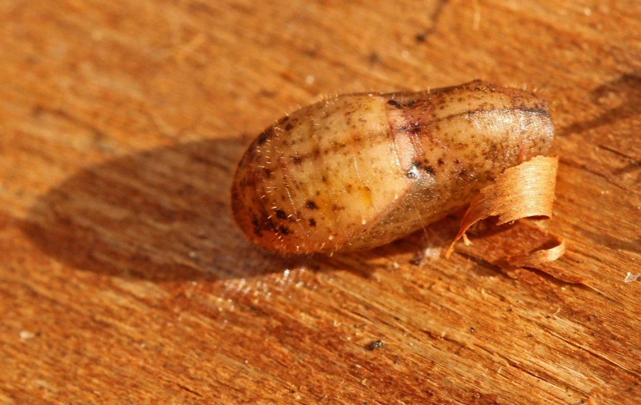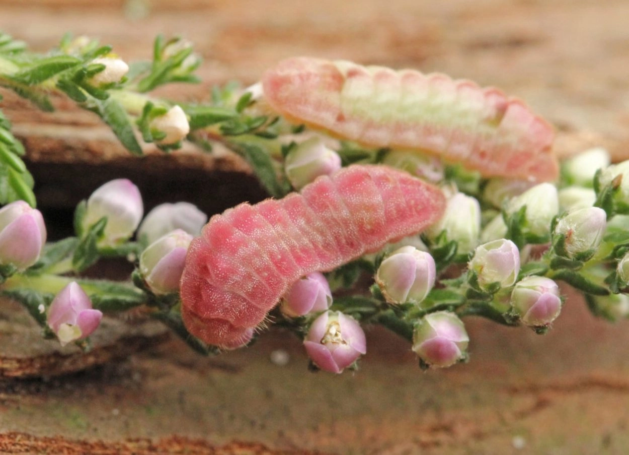 Tot 13 mm; vrij dik, naar de uiteinden versmald; lichaam groen of geelachtig groen met onder de spiracula een witachtige lengtestreep; sommige vormen hebben een aantal witachtige, driehoekige vlekjes, die in een purperachtige of roze-achtige middenstreep over de rug liggen; soms is de rups geheel purperachtig roze van kleur; kop zwart, in het lichaam teruggetrokken.