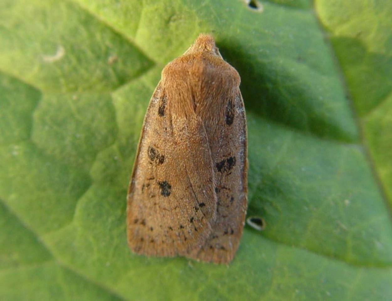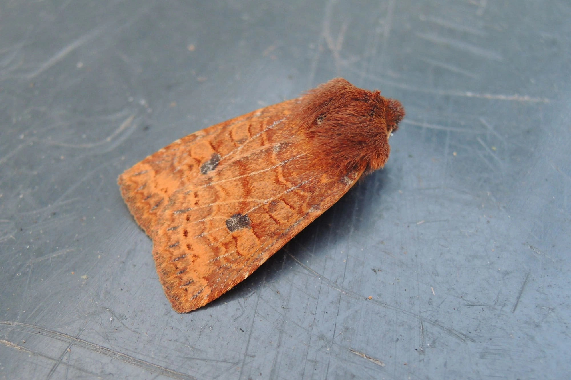 Voorvleugellengte: 14-15 mm. De achterrand van de voorvleugel is afgerond en wijkt bij de binnenrandhoek sterk naar binnen, waardoor deze uil te onderscheiden is van de meeste andere bruinachtige uilen die in het najaar en in het vroege voorjaar vliegen. Kleur en tekening zijn zeer variabel; de vlinder kan een effen maar ook een sterk gemarmerd uiterlijk hebben. De voorvleugel heeft een lichte of donkere oranjebruine kleur of een combinatie van beide; de grondkleur kan ook diep kastanjebruin zijn. Soms is de voorvleugel sterk lichtbruin of grijs bespikkeld en/of gestreept, of zijn de lichte dwarslijnen opvallend grijs of zwart gerand. Soms ook zijn de aders als lichte lijnen zichtbaar. In sommige gevallen heeft de voorvleugel extra veel zwart.