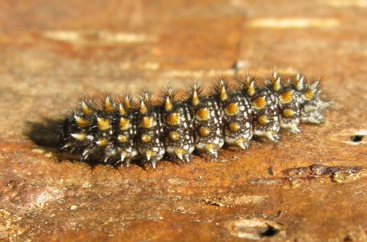 Tot 25 mm; lichaam zwart met grijsachtig witte stippen; doorns oranje-geel met witte uiteinden; buikpoten grijsachtig wit; kop zwart met witte tekening.