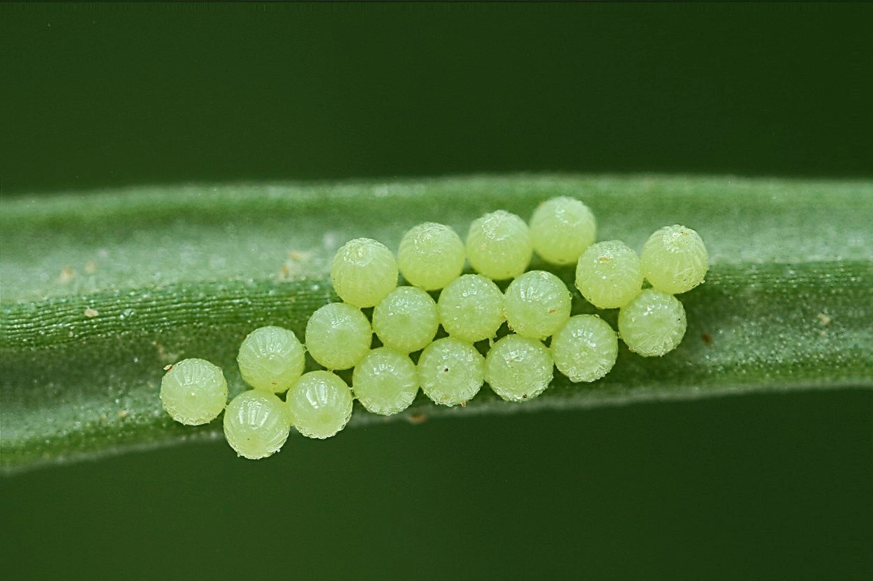 De vrouwtjes paren meestal binnen enkele uren nadat ze uit de pop zijn gekomen. Daarna duurt het nog vrij lang, gemiddeld zo´n 8 dagen - voordat de eitjes rijp zijn. Als een vrouwtje de eitjes wil afzetten vliegt ze traag en log vlak boven de vegetatie. Als een geschikte plek is gevonden, landt ze en loopt vervolgens verder. Tijdens het afzetten van de eitjes stopt ze regelmatig om even te zonnen. De eitjes worden in groepjes van 80 tot 150 stuks afgezet op de onderkant van een blad van de waardplant of op een plant die dichtbij de waardplant groeit. De voorkeur gaat uit naar lage planten op open, zonnige plaatsen. Als er planten gebruikt worden die op tamelijk beschaduwde plaatsen groeien, moet er steeds een zonnige plek in de buurt zijn. Soms is er na enkele dagen nog een tweede, kleiner legsel van circa 50 tot 100 eitjes.