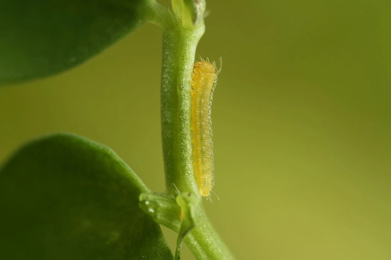 De rupsen eten gelijkmatig van alle bladeren van de plant. In rust strekken zij zich uit langs de stengel van een bloem of blad en zijn dan lastig te vinden. De verpopping vindt plaats op een stevige stengel, meestal verborgen tussen het gras. Hier overwinteren de poppen van de tweede generatie.
