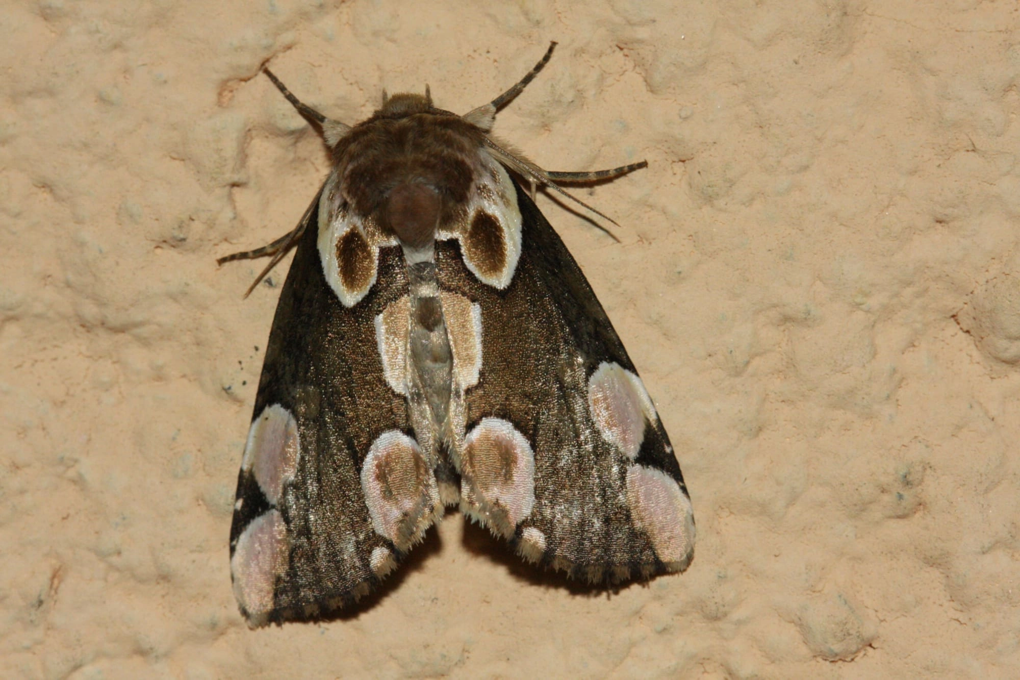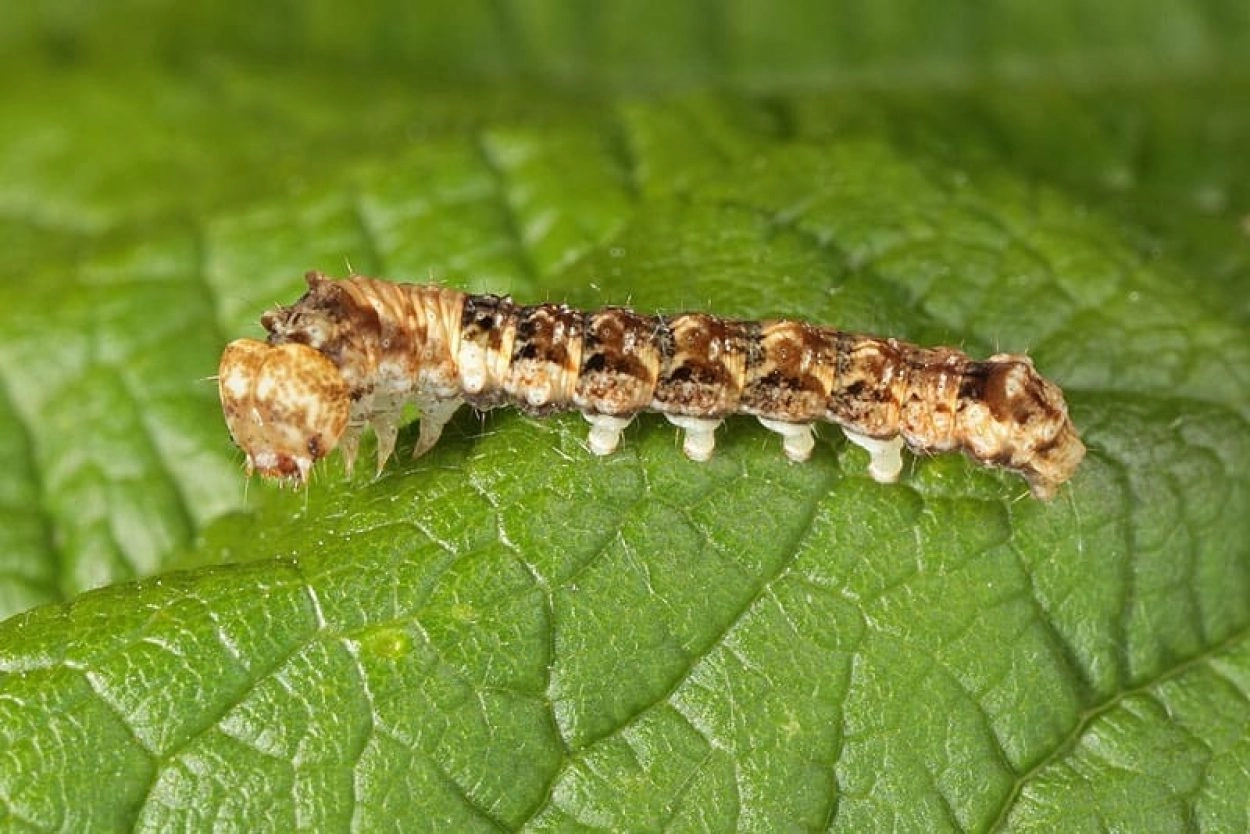Tot 35 mm; lichaam verbreed achter de kop, segment twee met een opvallende voorwaarts gerichte bult; van boven gezien zijn de segmenten sterk ingesneden; kleur bleek roodachtig bruin of purperachtig bruin met een lengterij lichte, driehoekige vlekken over de rug; segment vijf, negen en elf elk met een klein bultje op de rugzijde; kop lichtbruin met donkerder tekening, licht ingesneden.