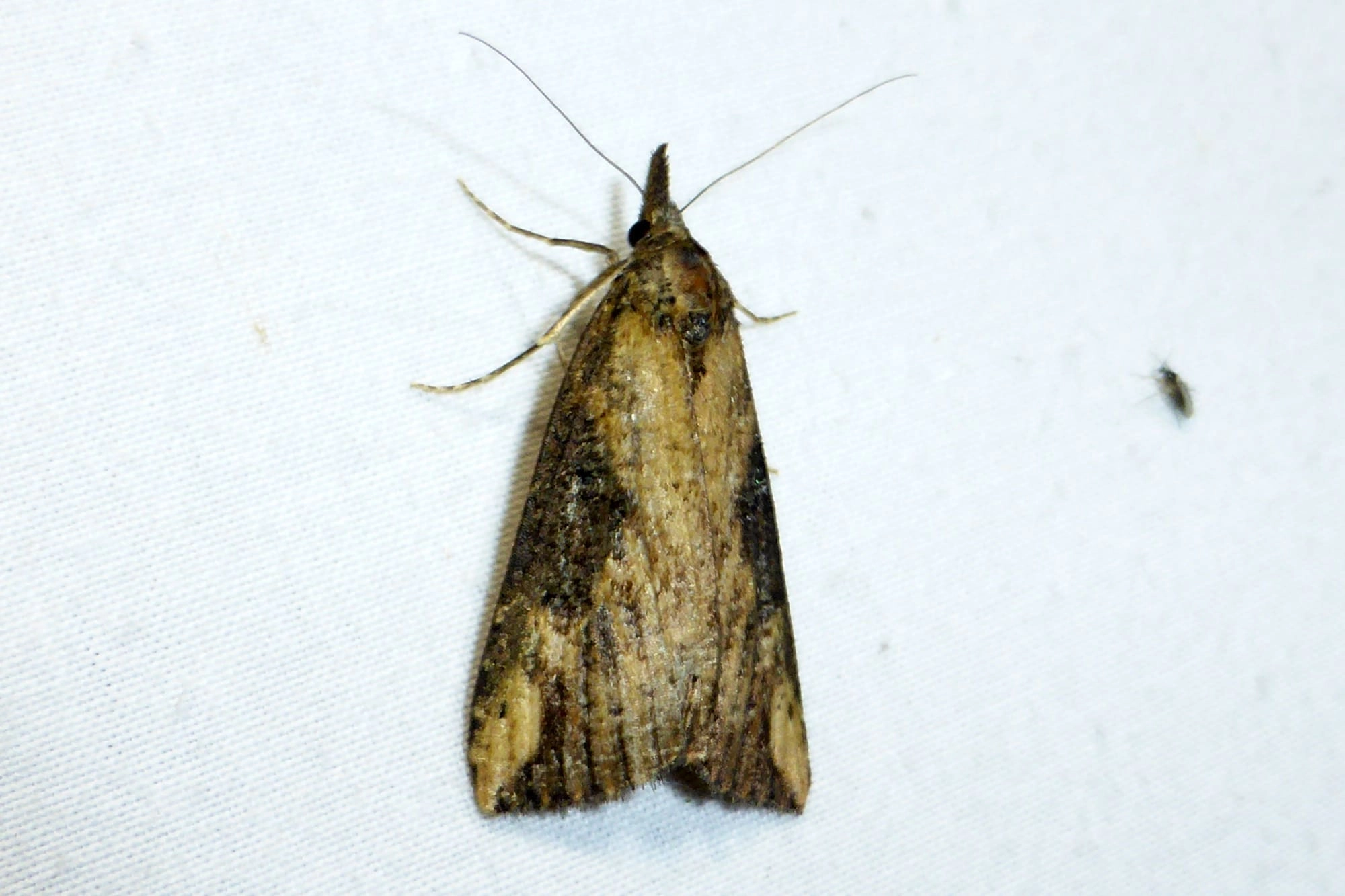 Voorvleugellengte: 18-22 mm. Evenals de andere snuituilen heeft deze soort een opvallende 'snuit', gevormd door de lange palpen. De vleugelpunt van de voorvleugel is vrij hoekig maar heeft geen naar buiten wijkend puntje. De voorvleugel is gemarmerd met donkerbruin en lichter geelachtig bruin. Het deel langs de voorrand is over het algemeen donkerder dan de rest van de vleugel, vooral in het middenveld; bij de vleugelpunt is een opvallende lichte vlek zichtbaar.