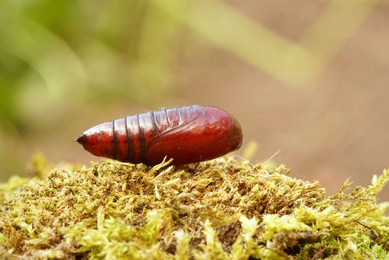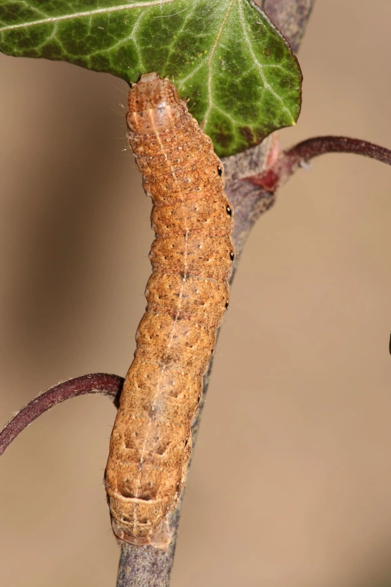 Tot 55 mm; lichaam okerkleurig bruin of roodachtig bruin, onderzijde lichter; over de rug een lichte middenstreep; op de rugzijde van de segmenten elf en twaalf lichte dwarsbanden achter donkere wigvormige vlekken; spiracula in zwarte vlekken; kop lichtbruin met donkerbruine spikkels.