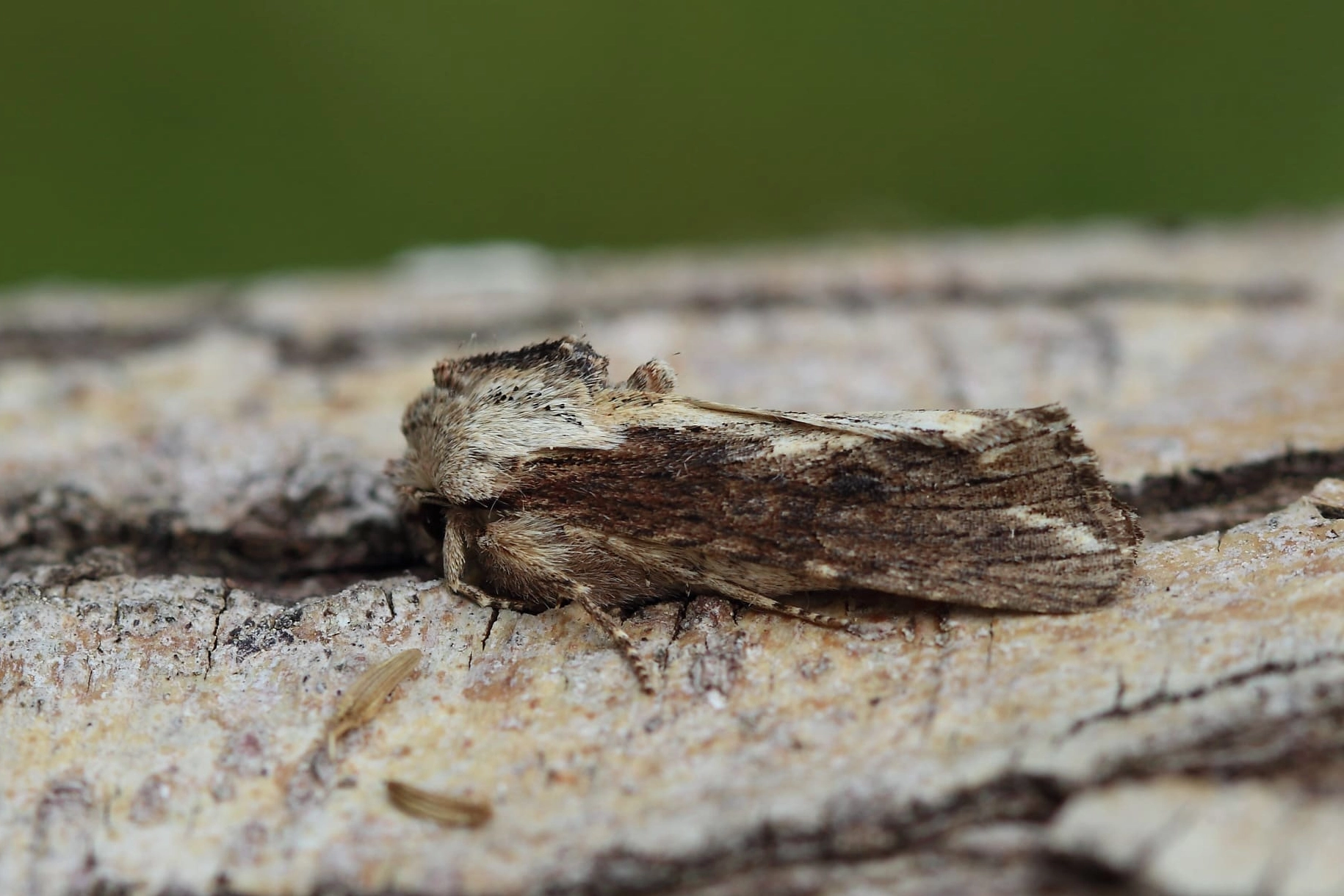 De geelbruine houtuil (Lithophane socia) heeft een bruinachtig grijze achtervleugel en puntige schouders.
