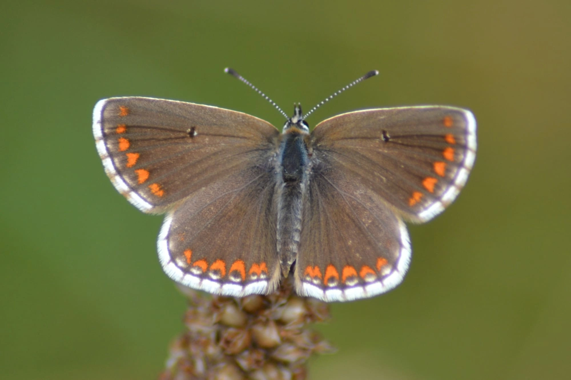 Verspreiding in de twintigste eeuwIn Nederland kwam hij aan het begin van de twintigste eeuw voor in de duinen, de Zeeuwse eilanden, Noord- en Zuid-Holland, het rivierengebied, Zuid-Limburg en op een beperkt aantal plaatsen elders in het land. In de periode 1915-1945 is de soort achteruitgegaan en vanaf midden vorige eeuw werd hij vrijwel uitsluitend langs de kust waargenomen en heel lokaal in het rivierengebied. Huidige verspreidingVanaf 2000 heeft het bruin blauwtje zich vanuit de duinen en het oostelijk rivierengebied over vrijwel heel Nederland verspreid. Daarbij werd in twintig jaar het hele binnenland bezet, met uitzondering van de drie noordelijke provincies. De verwachting is dat de soort daar ook binnenkort zal opduiken. De aantallen zijn vaak laag, maar juist in de duinen, Zeeland en het Oostelijk rivierengebied (waar de soort twintig jaar geleden ook al voorkwam) worden de meeste vlinders geteld.