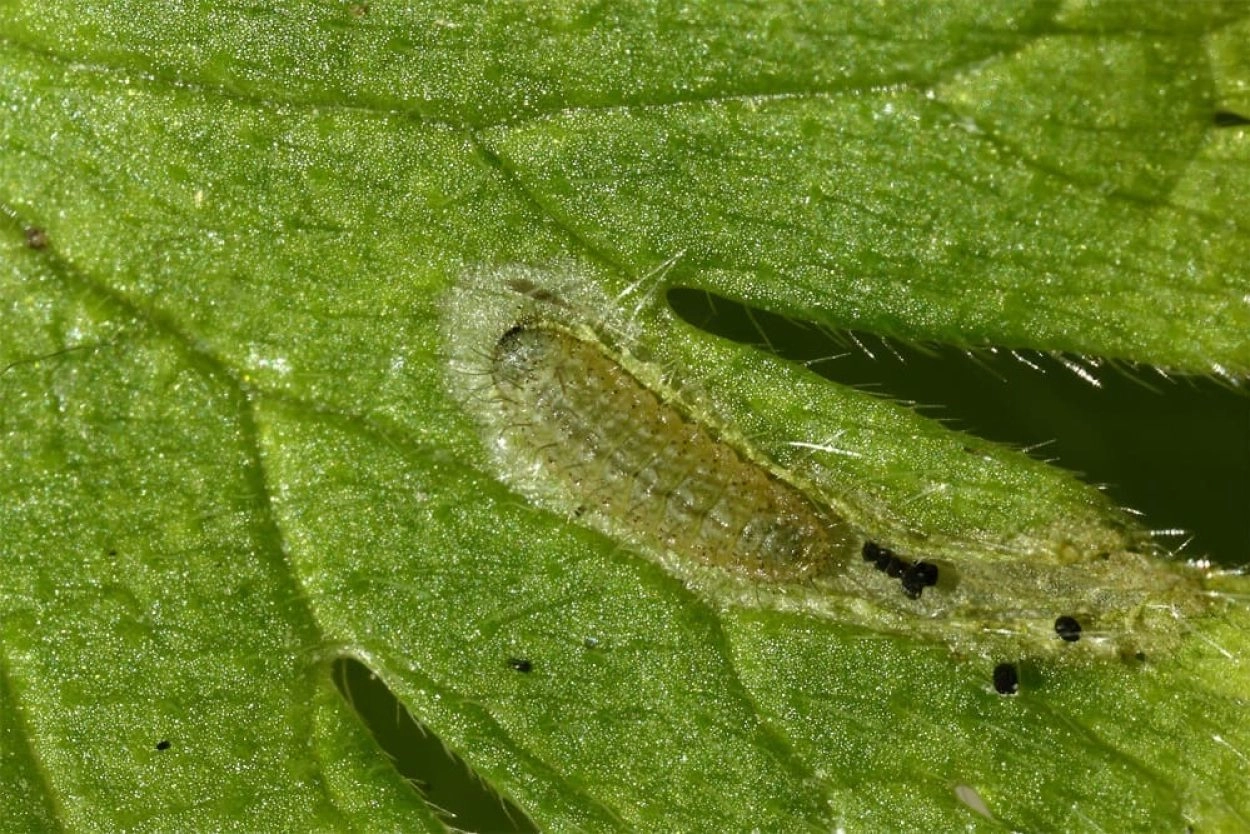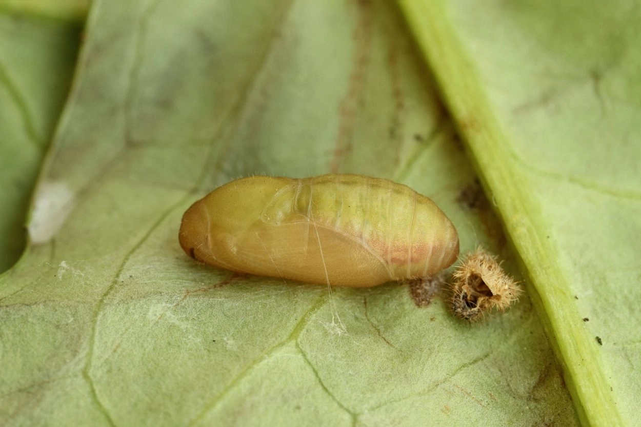 De jonge rups eet de onderzijde van het weefsel van het blad en beschadigt de bovenste bladlaag niet. Deze mineergang met een kleine opening aan de onderzijde van het blad is vrij opvallend. Oudere rupsen eten niet alleen het volledige blad maar ook de bloemen en de vruchten. Soms worden rupsen verzorgd door mieren. Uit verschillende onderzoeken blijkt dat vlinders die als rups regelmatig door mieren zijn verzorgd, 10% groter zijn dan vlinders van niet verzorgde rupsen. De ontwikkeling van deze grotere individuen duurt echter een dag langer. De rups verpopt in de strooisellaag nabij de waardplant. Rupsen van de tweede generatie overwinteren, meestal op de grond onder de waardplant.