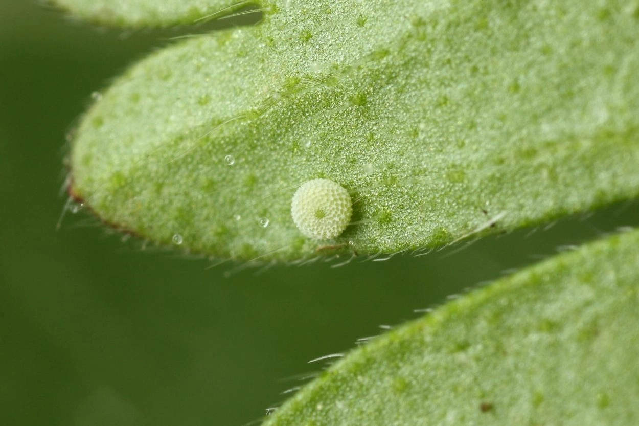 Het vrouwtje dat eitjes wil afzetten vliegt met een fladderende vlucht laag boven de vegetatie om een geschikte plaats te vinden. Ze gebruikt planten met dikke, vlezige bladeren. Die groeien doorgaans in een beschutte, zonnige laagte of op kale open grond. Het eitje wordt vaak aan de onderzijde van het blad afgezet.