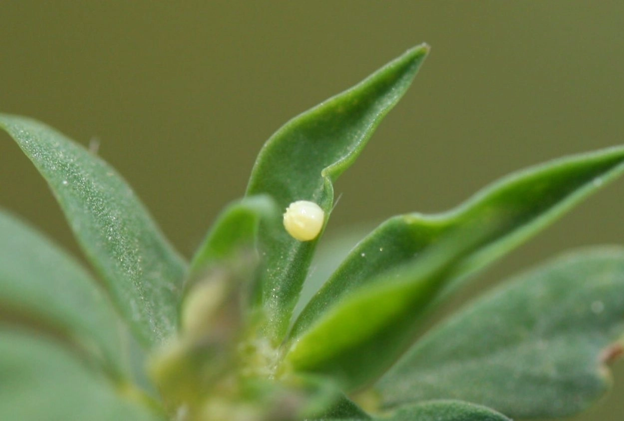 Een vrouwtje dat op zoek is naar een geschikte afzetplaats voor de eitjes vliegt laag boven de grond. Meestal legt ze het eitje op een jonge, maar toch forse plant die op een open plek tussen een lage vegetatie of op kale grond groeit. Er wordt één eitje afgezet op de bovenzijde van een blad aan de top van de plant.