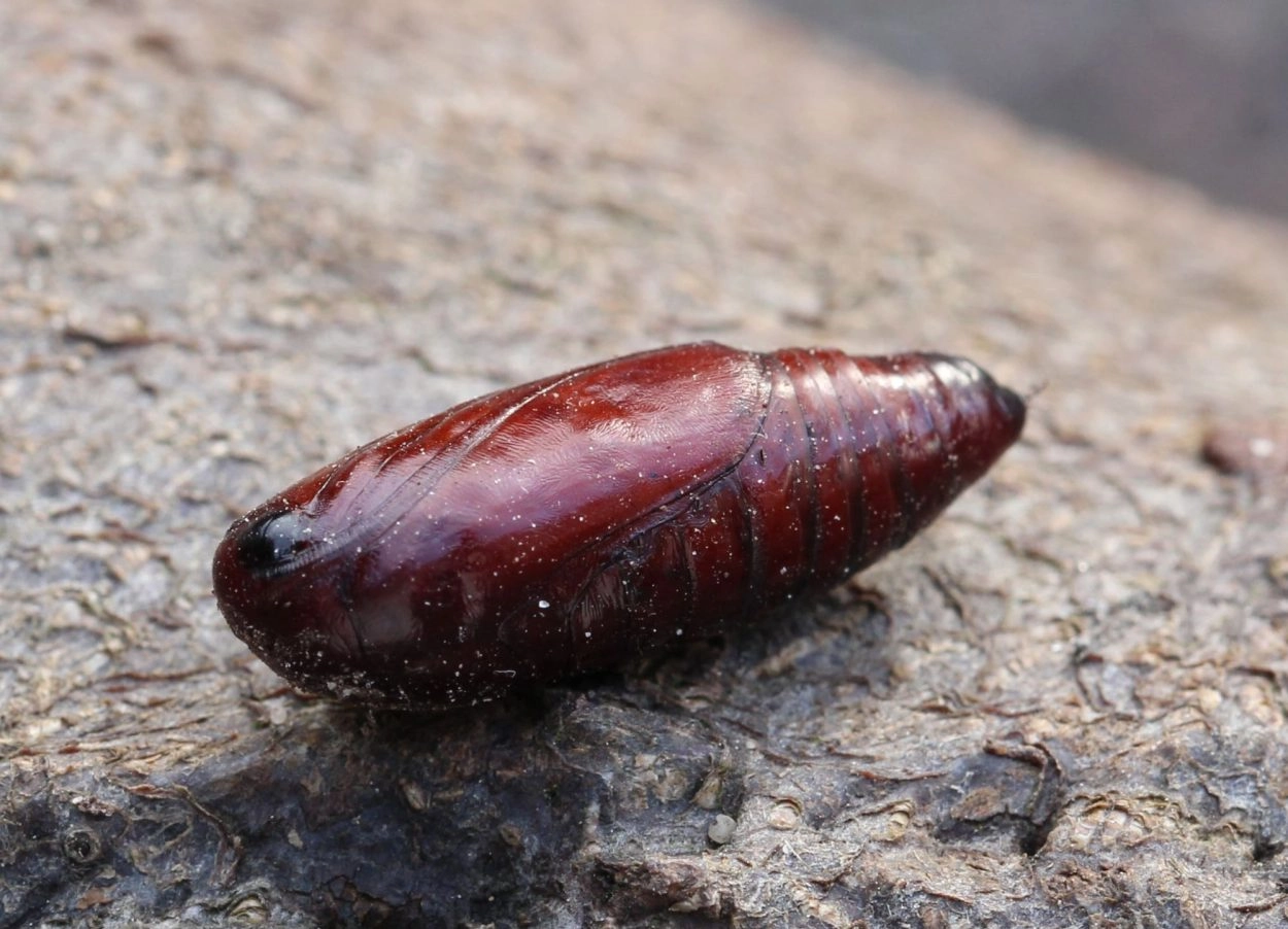 Tot 33 mm; plomp, lichaam licht of donker roodachtig bruin, beneden de spiracula lichter; over het midden van de rug een gebroken witte lengtestreep die door een rij bleke, chevron-achtige vlekken loopt; over de rugzijde van segment elf een opvallende, geelachtig witte dwarsband; kop glimmend bruin met twee donkere banden.