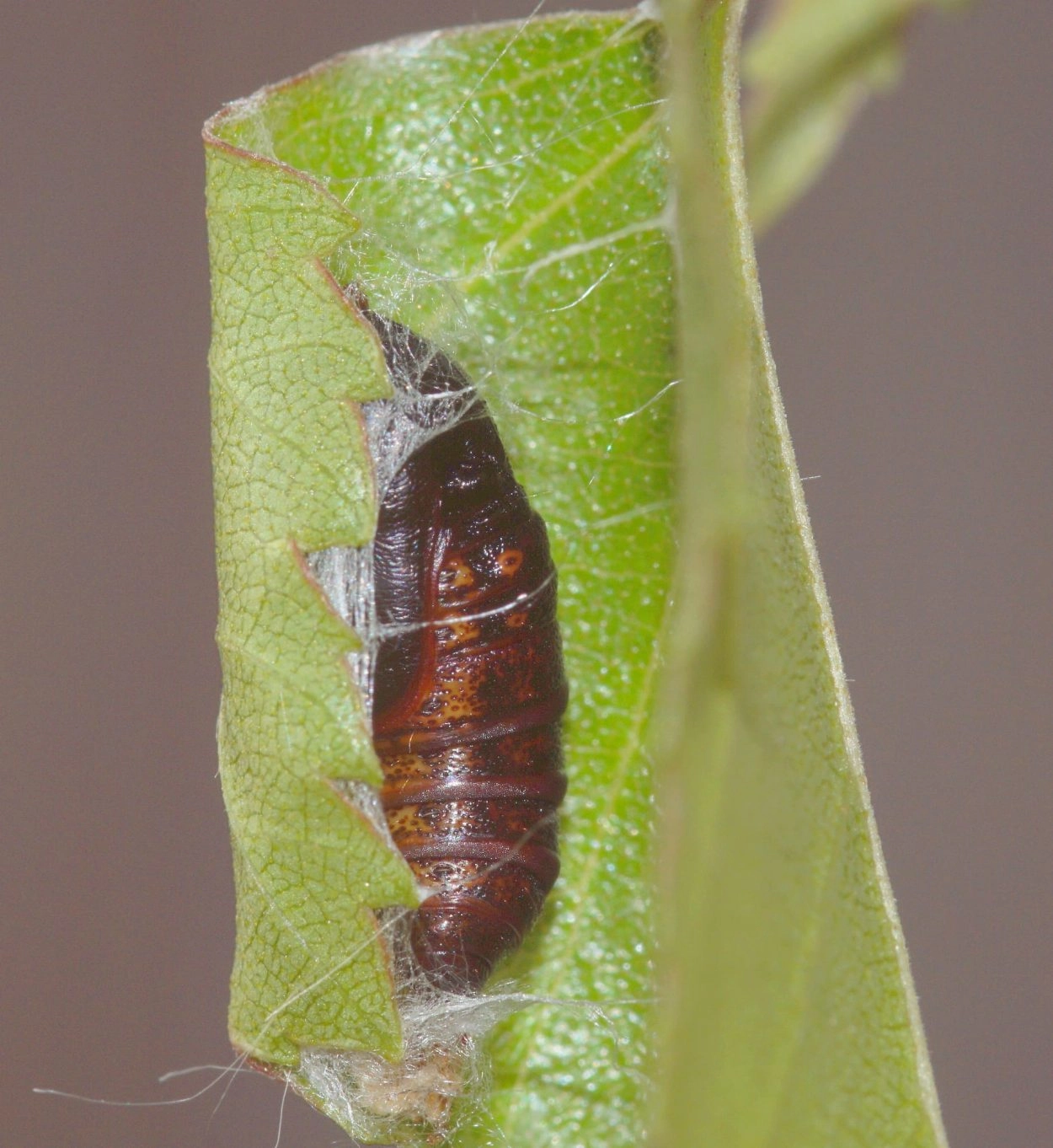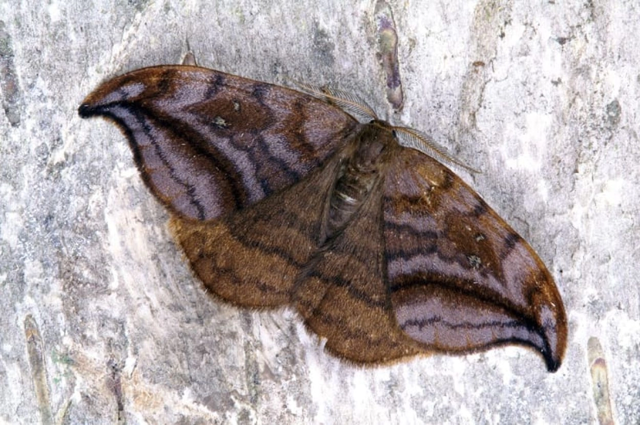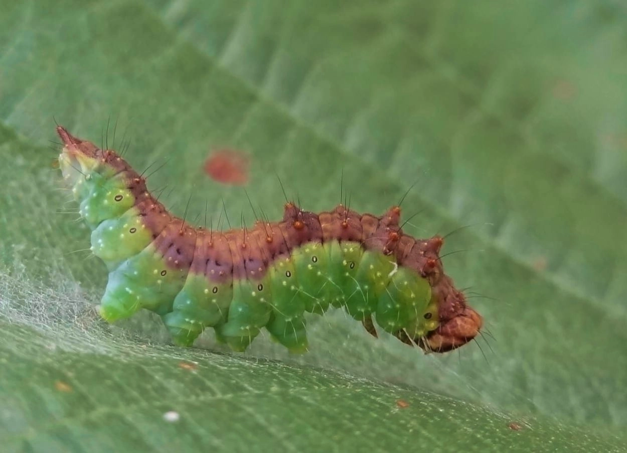 Berkeneenstaart (Drepana falcataria). De scheiding tussen de donkere bovenkant en groene zijkant is bij berkeneenstaart scherp en contrastrijk, bij bruine eenstaart is die scheiding wat diffuus. N.B.: vergelijk behalve de uiterlijke kenmerken ook de tijd van het jaar waarin de rupsen voorkomen, het habitat en de waardplant(en).