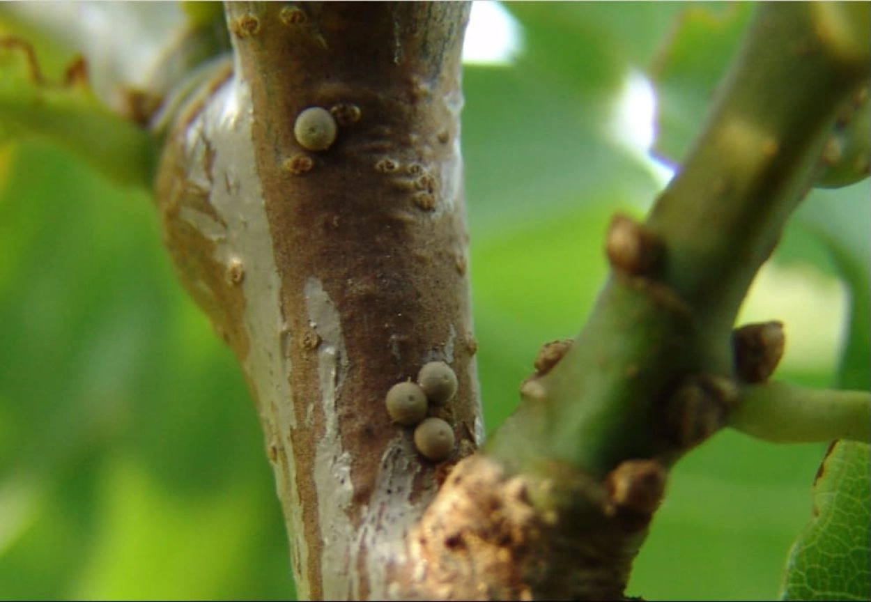 In tegenstelling tot de eikenpage legt de bruine eikenpage de eitjes op kleine boompjes: kwijnende boompjes die in de schaduw van hogere groeien, miezerige exemplaren die op te arme grond groeien, opslag van jonge eikjes. Meestal zet het vrouwtje de eitjes afzonderlijk af op een halve tot anderhalve meter hoogte. Hoe hoger de eik, hoe hoger het eitje wordt afgezet. Vaak worden de eitjes aan de zuidoostkant van de boompjes afgezet op een stam, tak of twijg met een gladde bast zonder korstmossen. Daar overwinteren ze.
