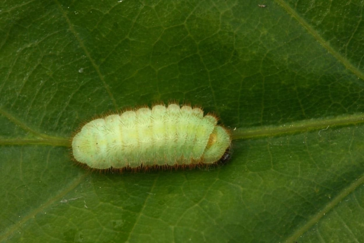 In april komen de rupsen uit het ei. De jonge rupsen lopen naar de pas geopende groeiknoppen van de takken. Ze kruipen weg in die knoppen en eten van het uitlopende blad. Rupsen bijten eerst de hoofdnerf door, zodat het blad iets verwelkt; pas de dag daarna wordt het daadwerkelijk geconsumeerd. Rupsen in het derde stadium brengen de dag door aan de onderzijde van bladeren. Deze rupsen hebben geregeld gezelschap van mieren, maar ze zijn er niet afhankelijk van. De verpopping vindt plaats tussen strooisel en dorre bladeren, niet ver van het stammetje van de waardboom. De pop ligt vastgemaakt aan gras of stengels dicht bij de grond.