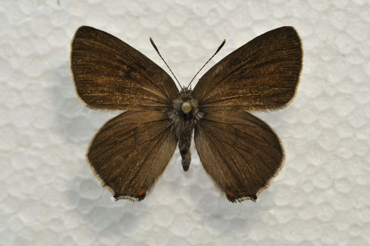 Voorvleugellengte: circa 16 mm. De grondkleur van de bovenkant van de vleugels is donkerbruin; bij het vrouwtje bevindt zich op de voorvleugel een oranje vlek die bij het mannetje ontbreekt. Over de onderkant van de achtervleugel loopt een dunne rij kleine witte vlekjes. Bij de binnenrandhoek verloopt de lijn onregelmatig zigzaggend, maar vormt geen duidelijke of minder duidelijke W. De rode maanvlekjes langs de achterrand van de onderkant van de achtervleugel zijn aan beide zijden zwart gerand. De achtervleugel heeft een klein staartje; soms bevindt zich bij het staartje een blauwe vlek.