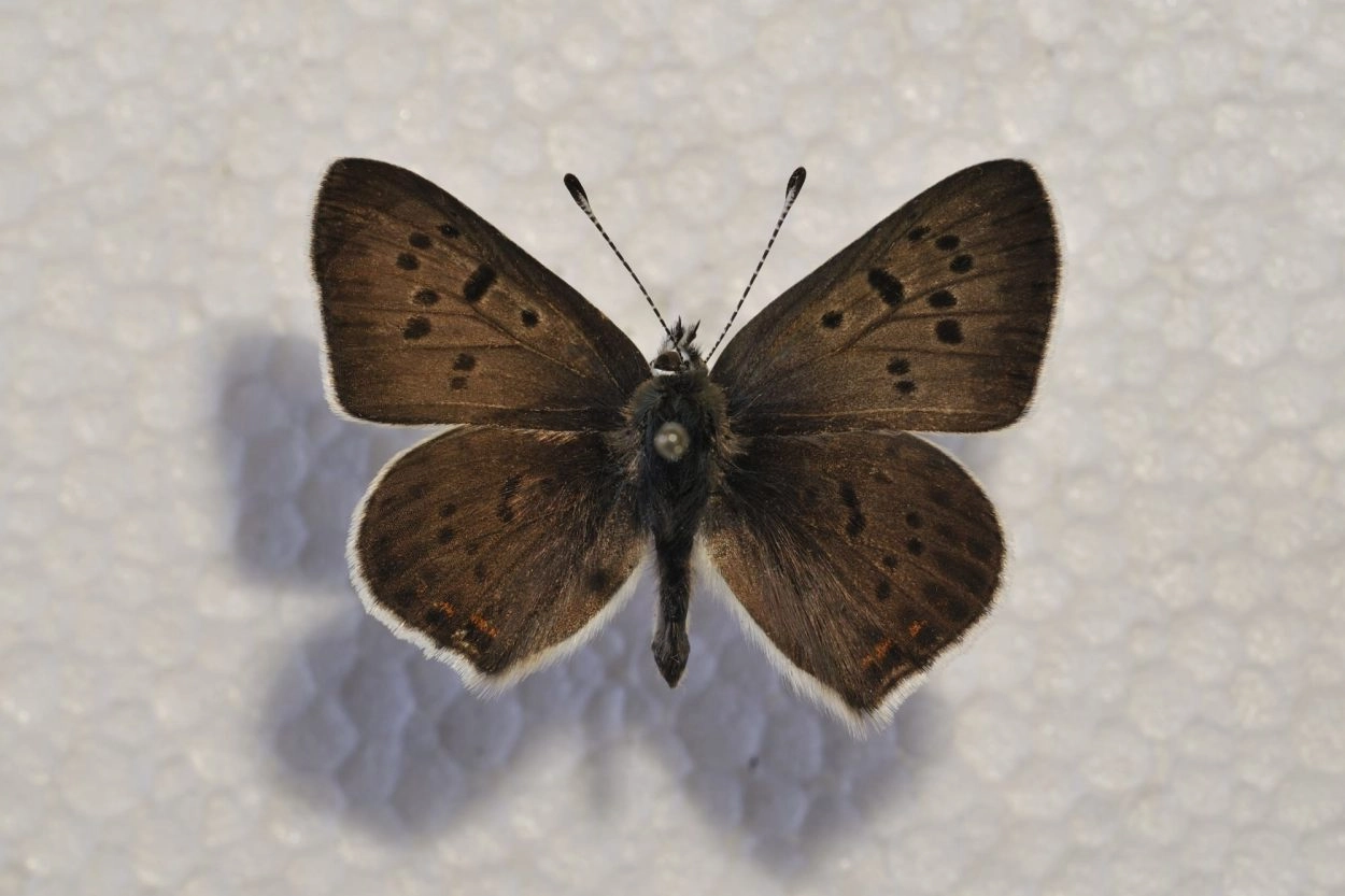 Voorvleugellengte: circa 14 mm. De onderkant van de achtervleugel heeft in tegenstelling tot de andere vuurvlinder-soorten een geelbruine grondkleur. Zowel op de voor- als op de achtervleugel bevinden zich oranje achterrandvlekken die scherp zwart zijn afgezet. De bovenkant van de voorvleugel van het mannetje is bruin met enkele zwarte vlekken; langs de achterrand bevinden zich oranje vlekjes. Bij het vrouwtje is de bovenkant van de voorvleugel oranje met zwarte vlekken.