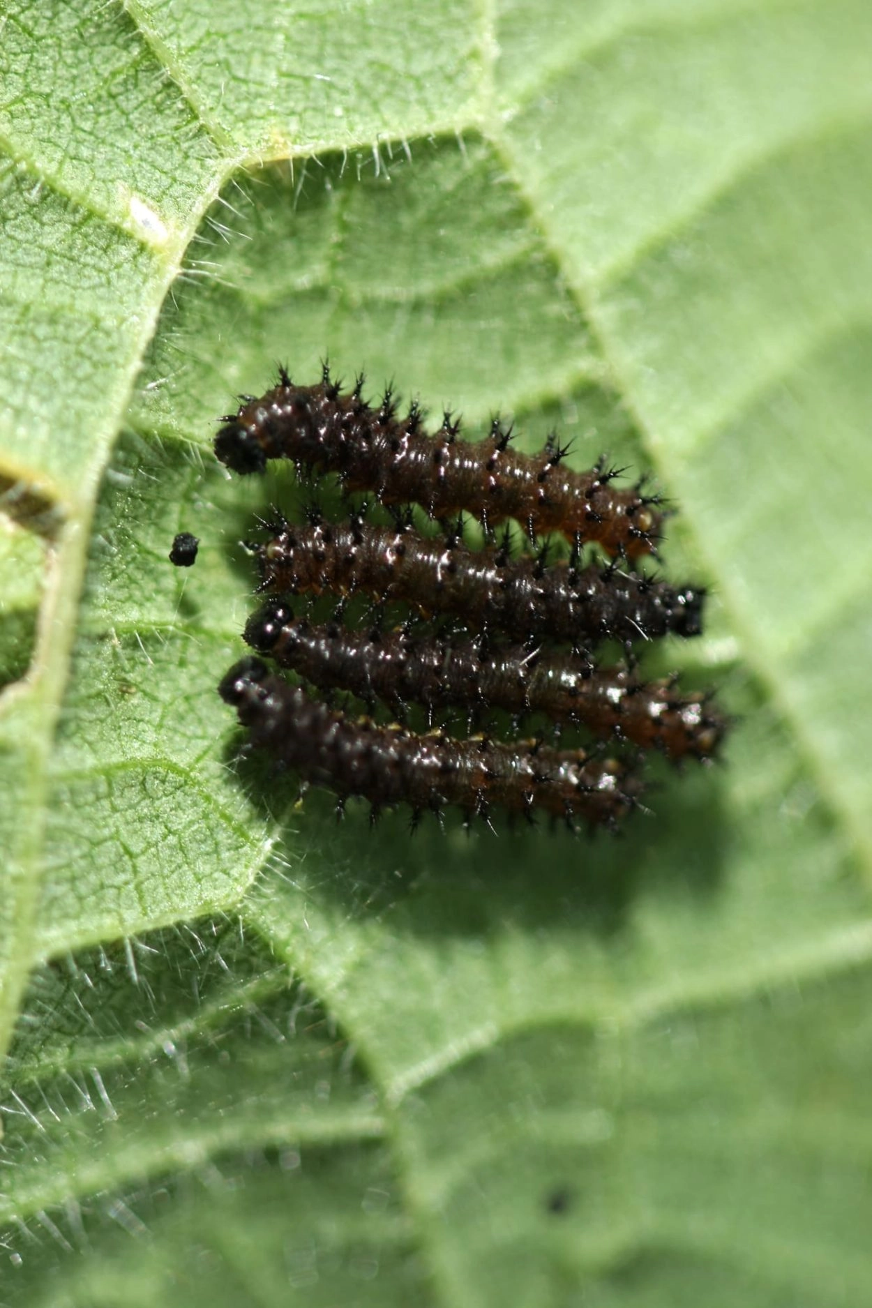 Tot 42 mm; lichaam zwart, fijn wit gespikkeld en met lange zwarte doorns op rug en flanken; buikpoten geelachtig bruin; kop glimmend zwart.