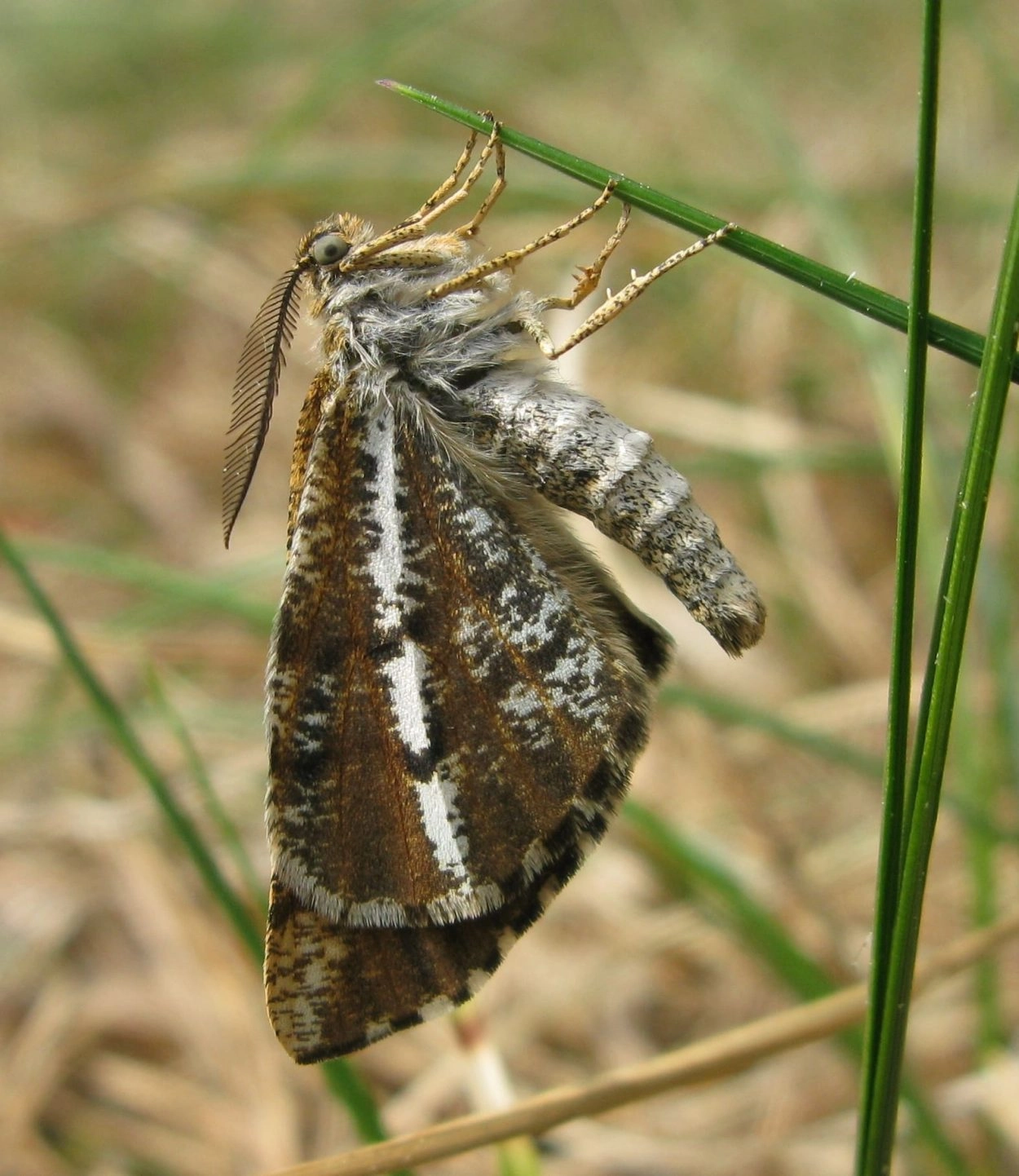 Voorvleugellengte: 17-19 mm. Bij het mannetje is de bovenkant van de voorvleugel zwartbruin langs de omtrek en in de vleugelpunt; het binnenste deel van de vleugel is witachtig geel. Bij het vrouwtje zijn de randen en de vleugelpunt middelbruin en is het binnenste deel van de vleugel lichtbruin. Net als een dagvlinder houdt deze soort de vleugels in rust tegen elkaar boven het lichaam, waarbij de witachtige streep en de donkere dwarslijnen op de onderzijde van de achtervleugel opvallen. Bij het mannetje zijn de antennen geveerd, bij het vrouwtje niet.