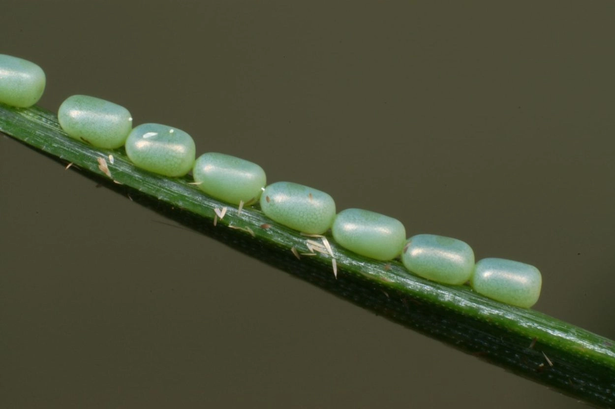 Tot 30 mm; lichaam helder groen met over de rug een brede, zwartgezoomde, witte middenstreep en een gele, met donkergroen gezoomde lengtestreep op de flanken; kop groen.