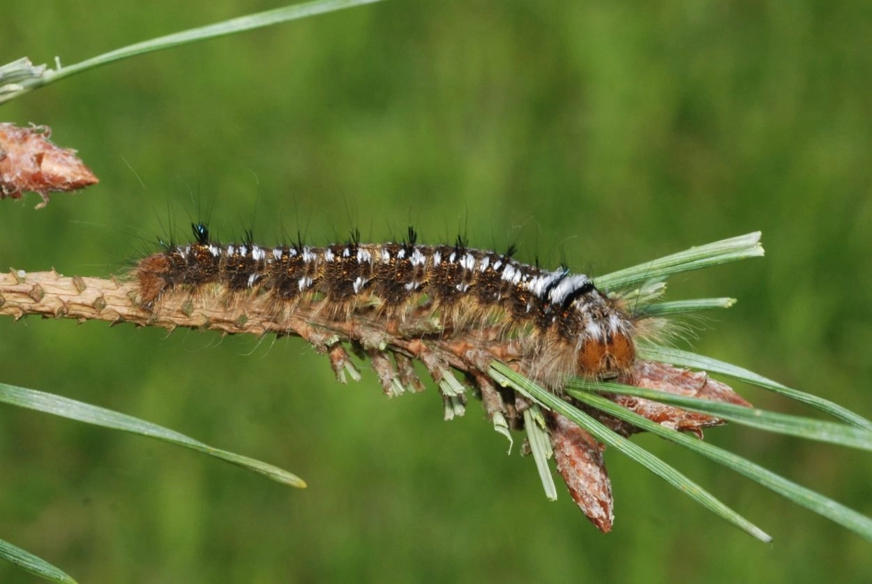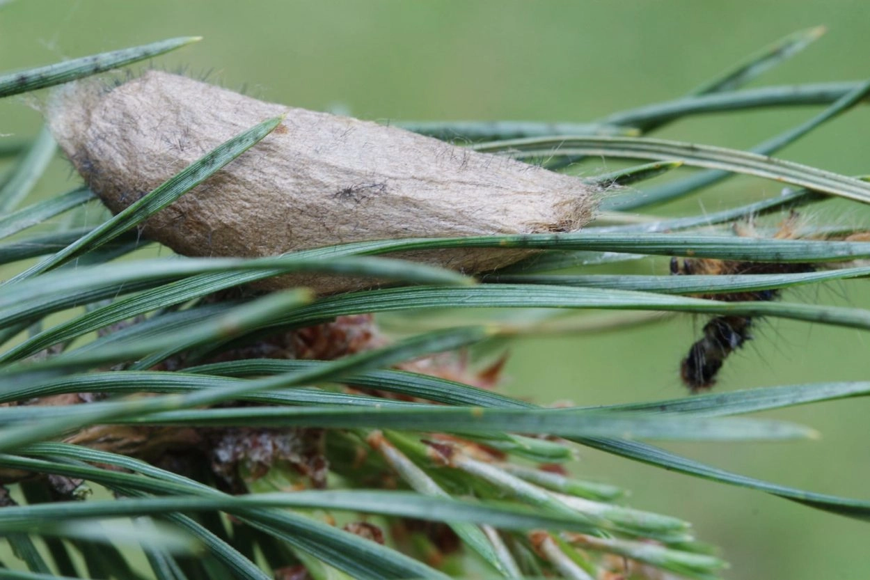 Rups: augustus-juni. De rups overwintert, soms tweemaal, meestal onder mos op de grond. Vanaf april kruipen de rupsen de bomen in, waarna de verpopping plaatsvindt in een grote bruine cocon die wordt vastgehecht tussen de naalden van de waardplant.