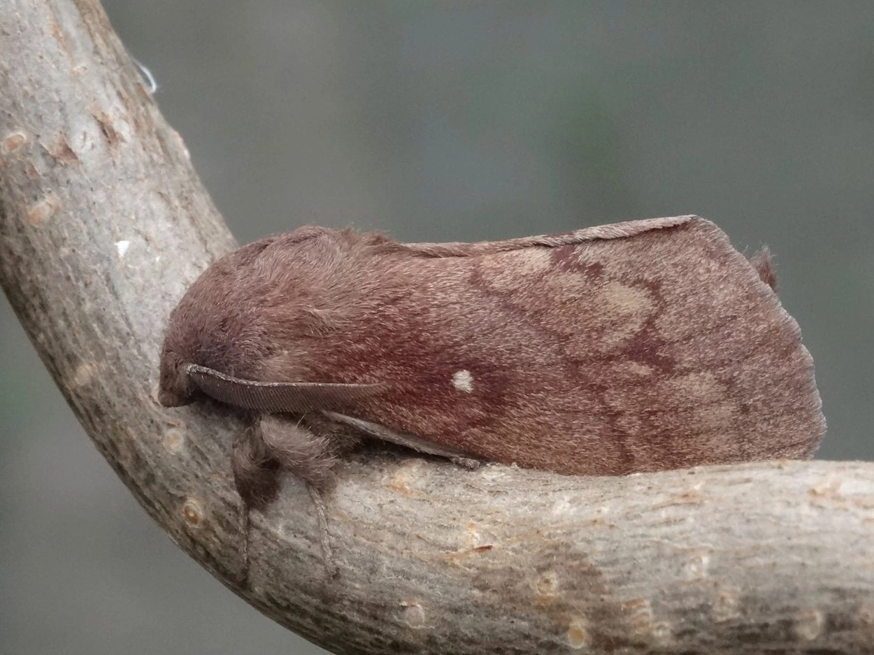 Voorvleugellengte: ♂ 25-30 mm, ♀ 30-35 mm. Een variabele spinner, die desondanks goed herkenbaar is. De voorvleugel heeft een opvallend witte middenvlek, een onregelmatig grof geschulpte golflijn en een karakteristiek patroon van roodachtig bruine en grijze banden; soms komen overwegend roodbruine of overwegend grijze exemplaren voor. Het mannetje is donkerder van kleur en bonter getekend dan het vrouwtje.