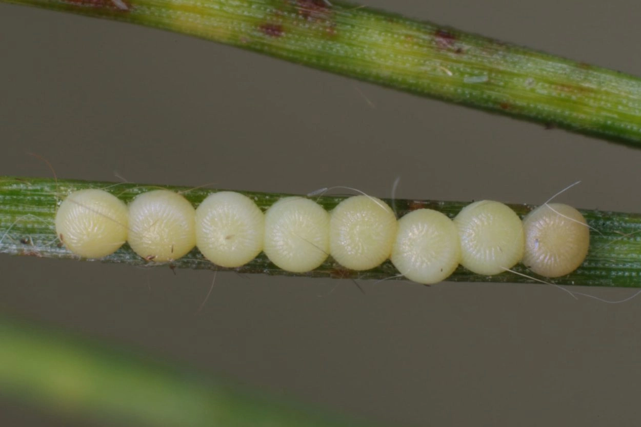 Rups: mei-juli. De rupsen leven eerst in groepen, later solitair. De soort overwintert als pop in een losse cocon in de strooisellaag of in een bastspleet. De eieren worden in rijen op volgroeide naalden afgezet.