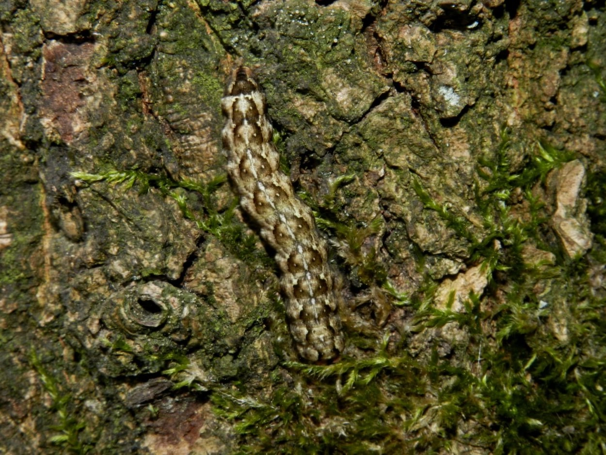 Tot 45 mm; vrij dik; lichaam variabel in kleur van roodachtig bruin tot groenachtig bruin of grijsachtig groen; een gebroken witachtige middenstreep loopt over de rug door een zwartachtige band, die vaak gebroken is tot een rij ruitvormige vlekken; boven de spiracula een donkere lengteband; kop bruin met lichte tekening.
