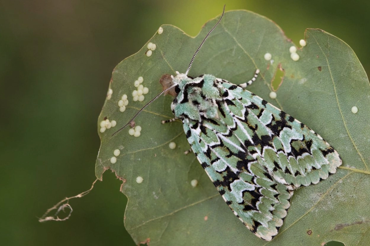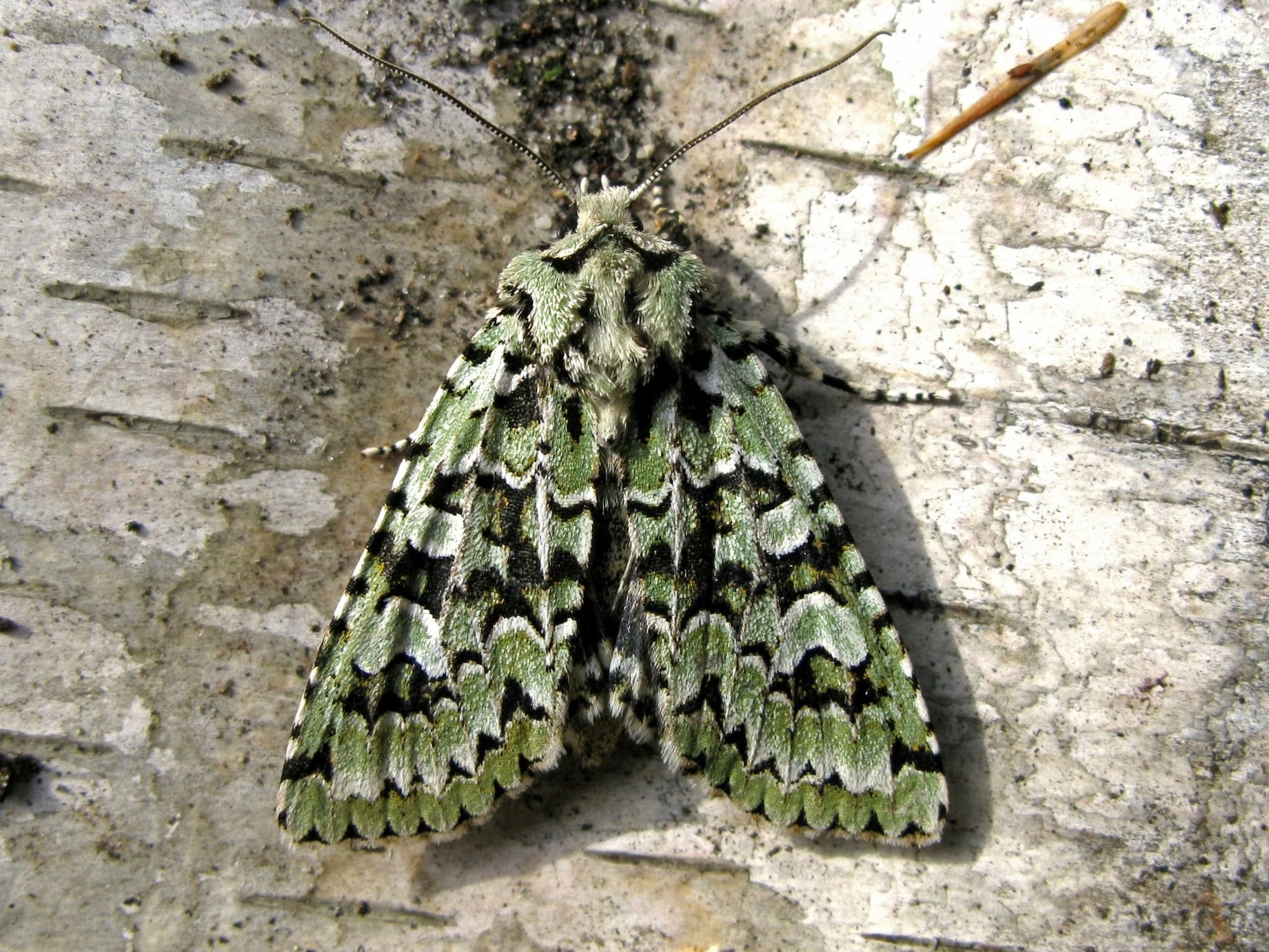 Voorvleugellengte: 18-23 mm. Een fraaie, karakteristiek getekende uil. De brede lichtgroene voorvleugel heeft een licht gebogen voorrand en een patroon van zwarte vlekken waarvan de meeste met wit zijn afgezet. De zwarte vlekken variëren in grootte; soms zijn ze gereduceerd tot kleine losliggende vlekjes en boogjes, in andere gevallen zijn ze groot en vormen ze vooral in het middenveld een zwarte dwarsband. In uitzonderlijke gevallen is de voorvleugel bijna geheel zwart, maar de uilvlekken blijven altijd zichtbaar als groene vlekken